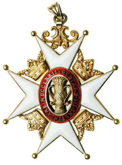 Sweden. Order of Vasa. Established 1772 for exceptional achievement in civil endeavors. Werlich-1224. A superb Knight First Class Breast Badge in fine gold and enamels, converted into a pendant with a bale at top for use with a chain. Choice Extremely Fine, very well made and beautiful.