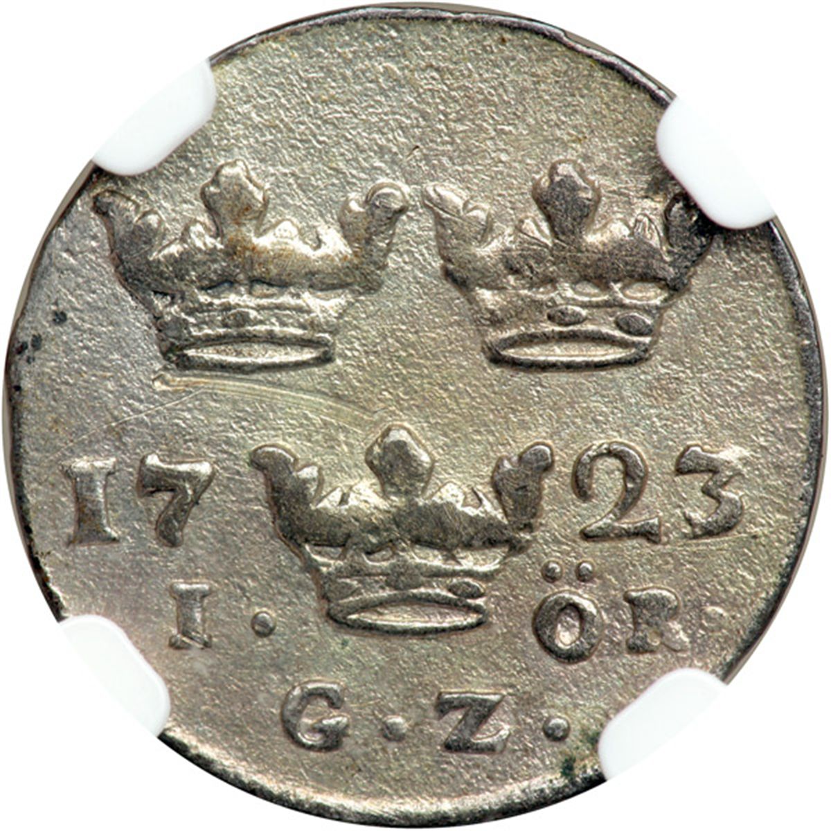 Sweden. Ore, 1723-GZ. Ahl-158a; KM-382. Fredrik I. Crowned F. Reverse: Three crowns. Toned. NGC graded Very Fine, Details (Surface Hairlines).