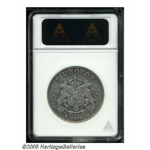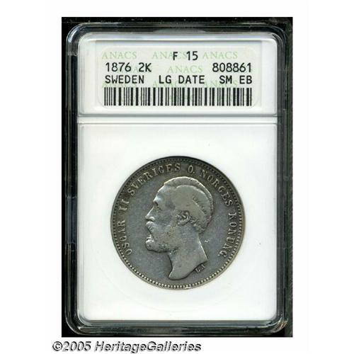 <B>Oscar II 2 Kronor 1876 Wide Date, </B></I>KM742, small EB, Fine 15 ANACS. A solid example of this rare variety with considerable detail showing and an attractive overall appearance.