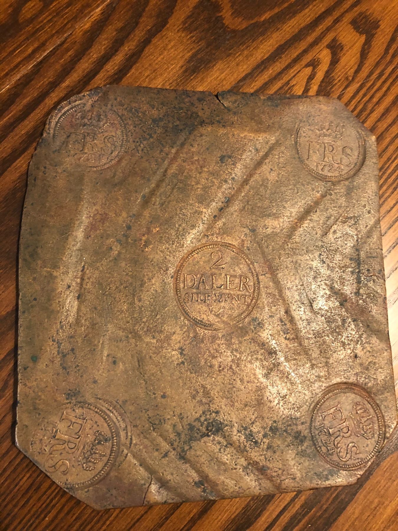 Description: Sweden, Plate Money, Frederick I, 2 Daler 1724 Avesta Mint, KM PM71, EF with bold stamps. Opitz pp. 255-56.