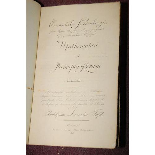 Swedenborgii, Emanuelis [Swedenborg, Emanuel]. A Group of 8 Volumes as Listed. Holmiae: Ex Officina Societatis Photo-Lithograficae, Folio - over 12" - 15" tall. Soft Cover. Ex-Library. Good Condition. Facsimile copies of Swedenborg's handwritten copies. Edited by Rudolphus Leonardus Tafel. All in blue stiff wraps. ***Mathematica et Principia Rerum Naturalium. (1870) viii, 444pp. ***Itineraria et Philosophica. (1870) 4, 196pp. ***Transactionum de Cerebro Fragmenta. (1870) vi, 458pp. ***Regnum Animale, Anatomice, Physice et Philosophice Perlustratum. (1869) vi, 627pp. ***Opusculum de Cultu et Amore Dei. (1870) iv, 114pp. ***Kiscellanea Theologica. (1870) iv, 3, [1] 1, 43pp, 2, 80pp, 2, 124pp, 2, 27pp [1] 2, 32pp. ***Apocalypsis Explicata Volumen Primum & Secundum - 2 Volumes (1870) 6, 580pp; 1 [1] 581-1164pp. Incomplete set, with volumes numbered 2-5 & 7-10.