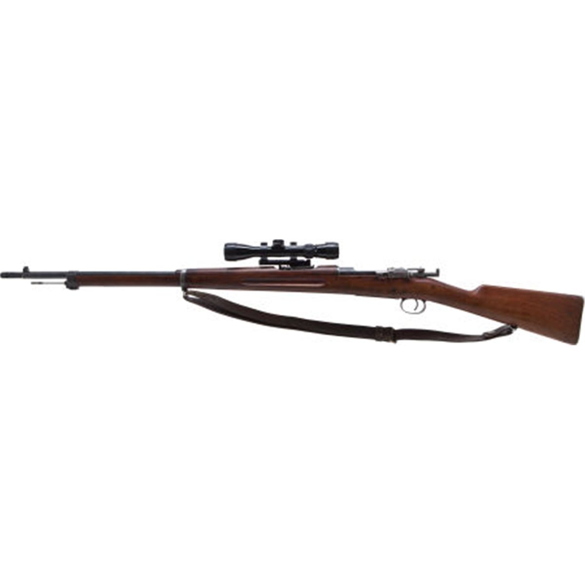 Swedish Mauser Model 1896 Bolt Action Rifle. Serial no. 273613. 6.5 X 55mm, 31-inch barrel with flash hider, standard front sight and mounted with Bushnell telescopic sight. Import stamps. Blued finish. Straight bolt toggle. Walnut stock and armguard. Brass disc in buttstock. Sling mounts and period leather sling. Condition: Very good as redone and reconfigured. Retaining approximately 85-90% reblued finish with scattered wear and scratches. Wood with wear and minor marks. Action good. NRA FIREARMS FOR FREEDOM PROGRAM