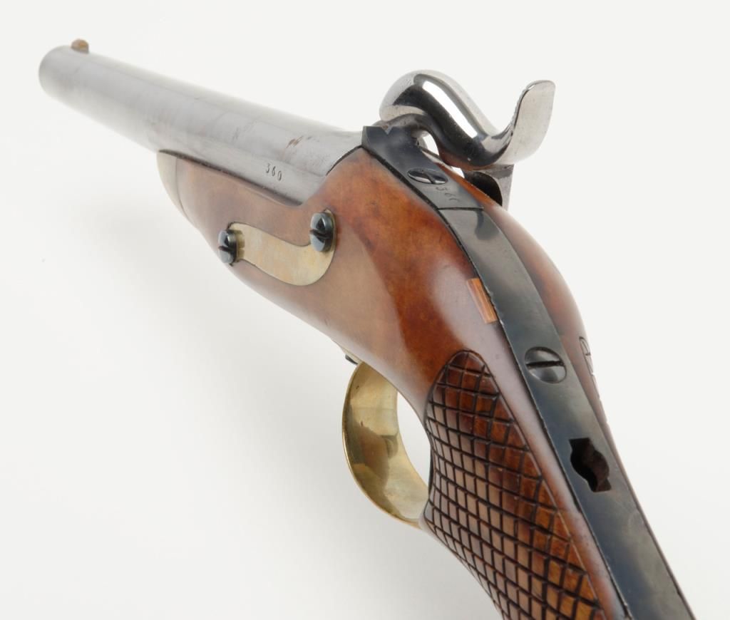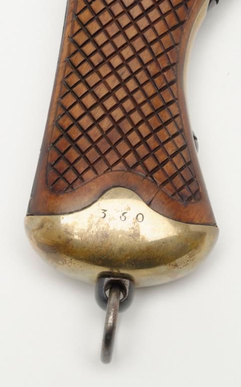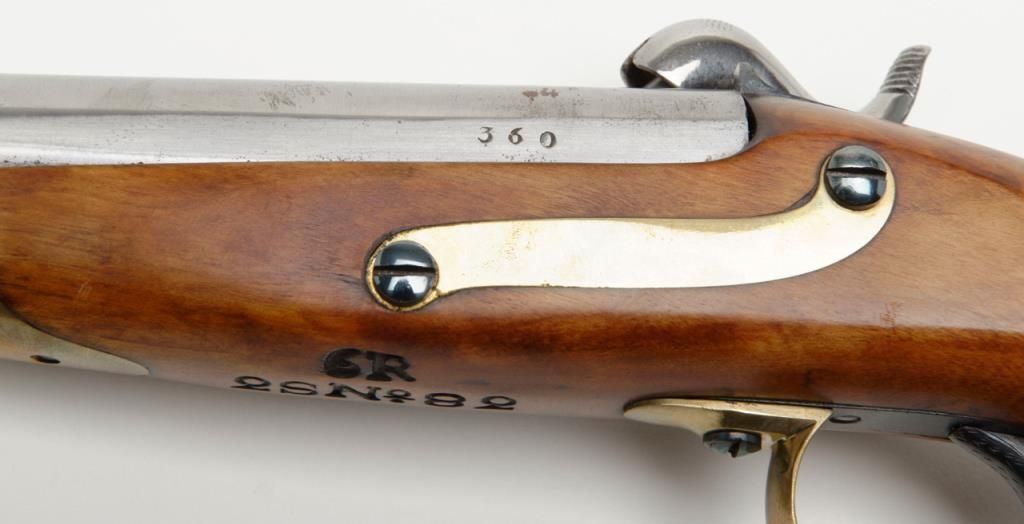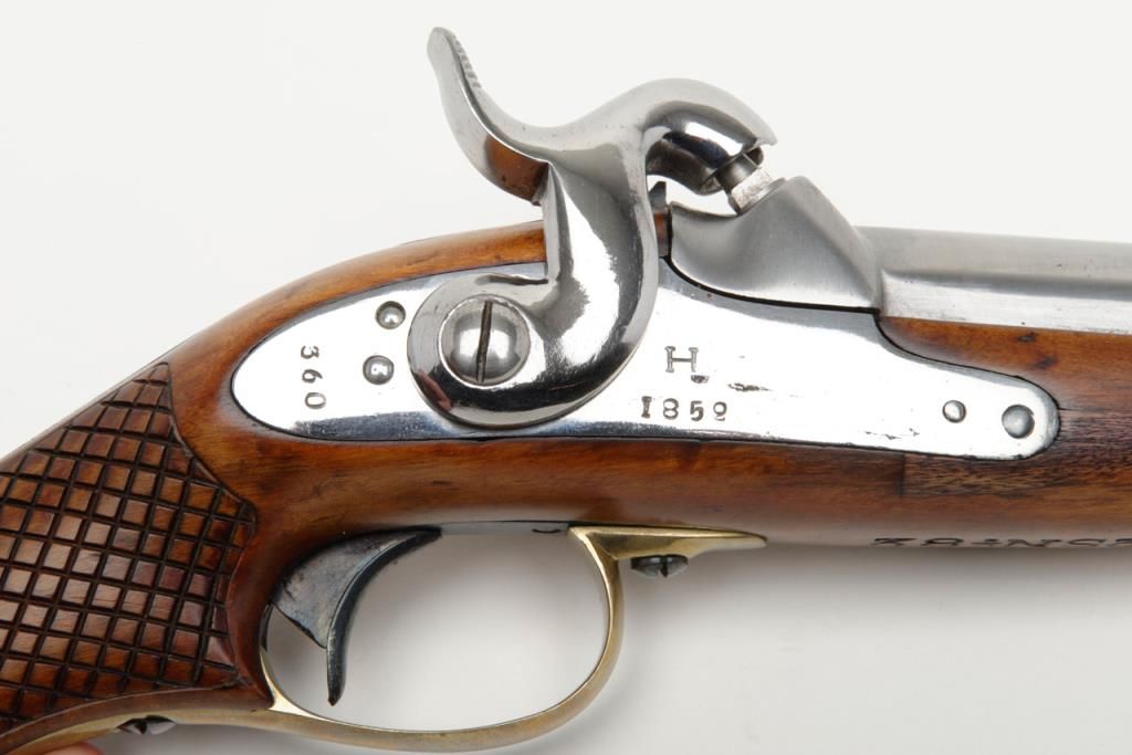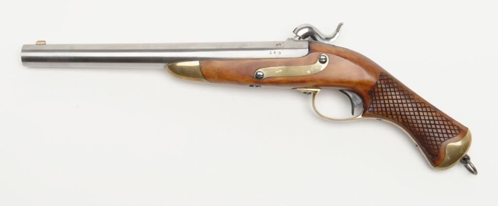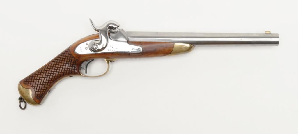 Swedish Military percussion horseman’s style percussion pistol showing full arsenal markings and 1859 date with serial number 360 on parts. The pistol measures 18 ½” overall with 11 ½” barrel of approximately .79 caliber smoothbore. Thepistol shows a Museum quality restoration with metal surfaces polished bright and screws fire blued. The stock shows a small area of replaced wood directly beneath the front screw of the lock plate. The markings are sharp and the edges arecrisp. The quality of the restoration is excellent. Est.: $800-$1600
