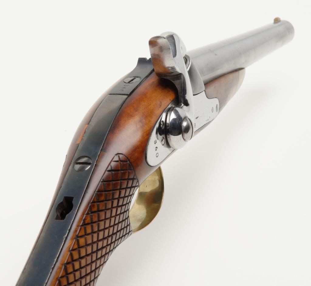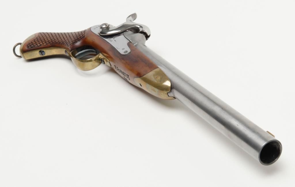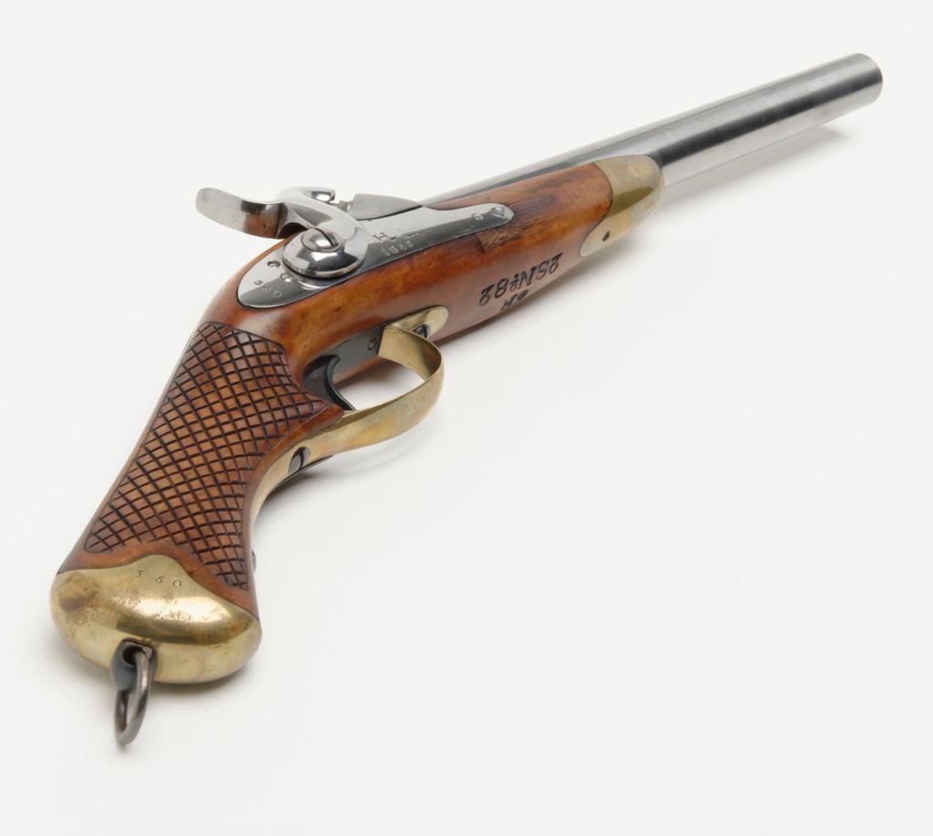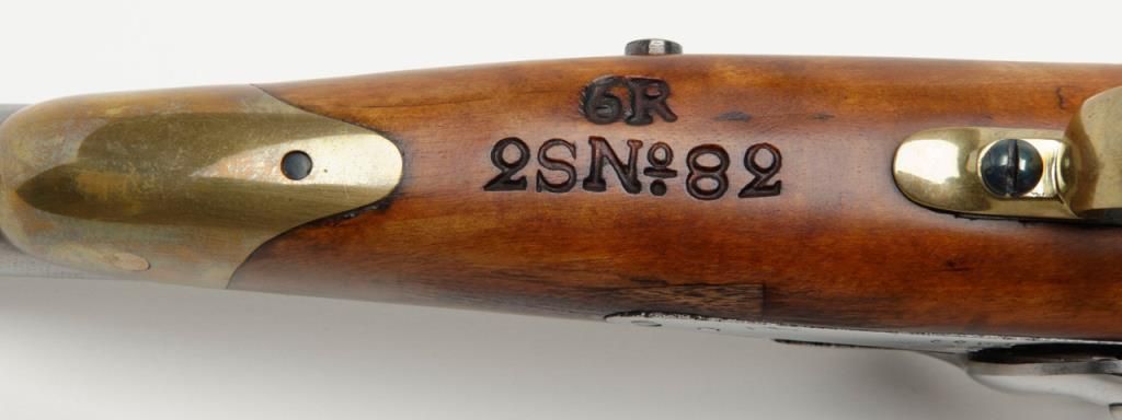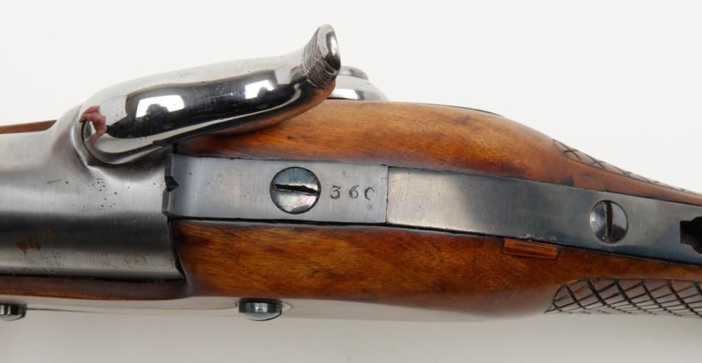 Swedish Military percussion horseman’s style percussion pistol showing full arsenal markings and 1859 date with serial number 360 on parts. The pistol measures 18 ½” overall with 11 ½” barrel of approximately .79 caliber smoothbore. Thepistol shows a Museum quality restoration with metal surfaces polished bright and screws fire blued. The stock shows a small area of replaced wood directly beneath the front screw of the lock plate. The markings are sharp and the edges arecrisp. The quality of the restoration is excellent. Est.: $800-$1600