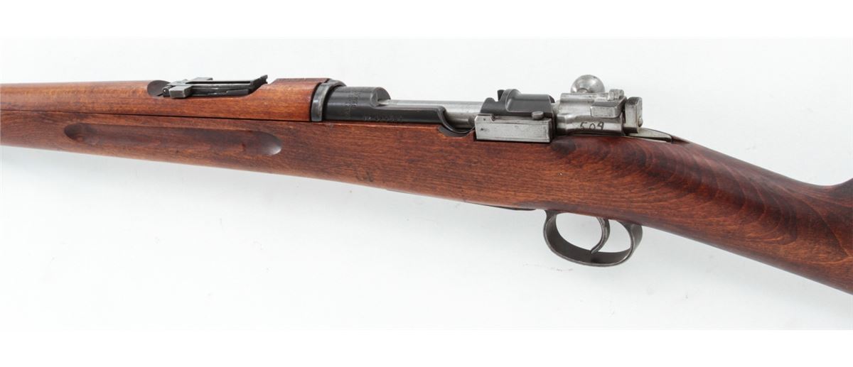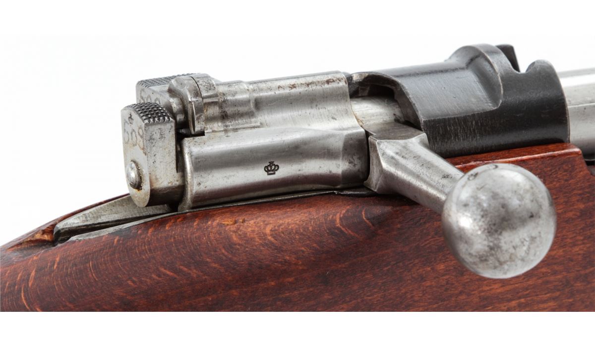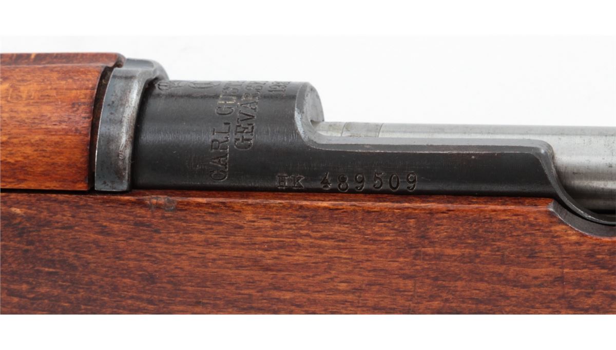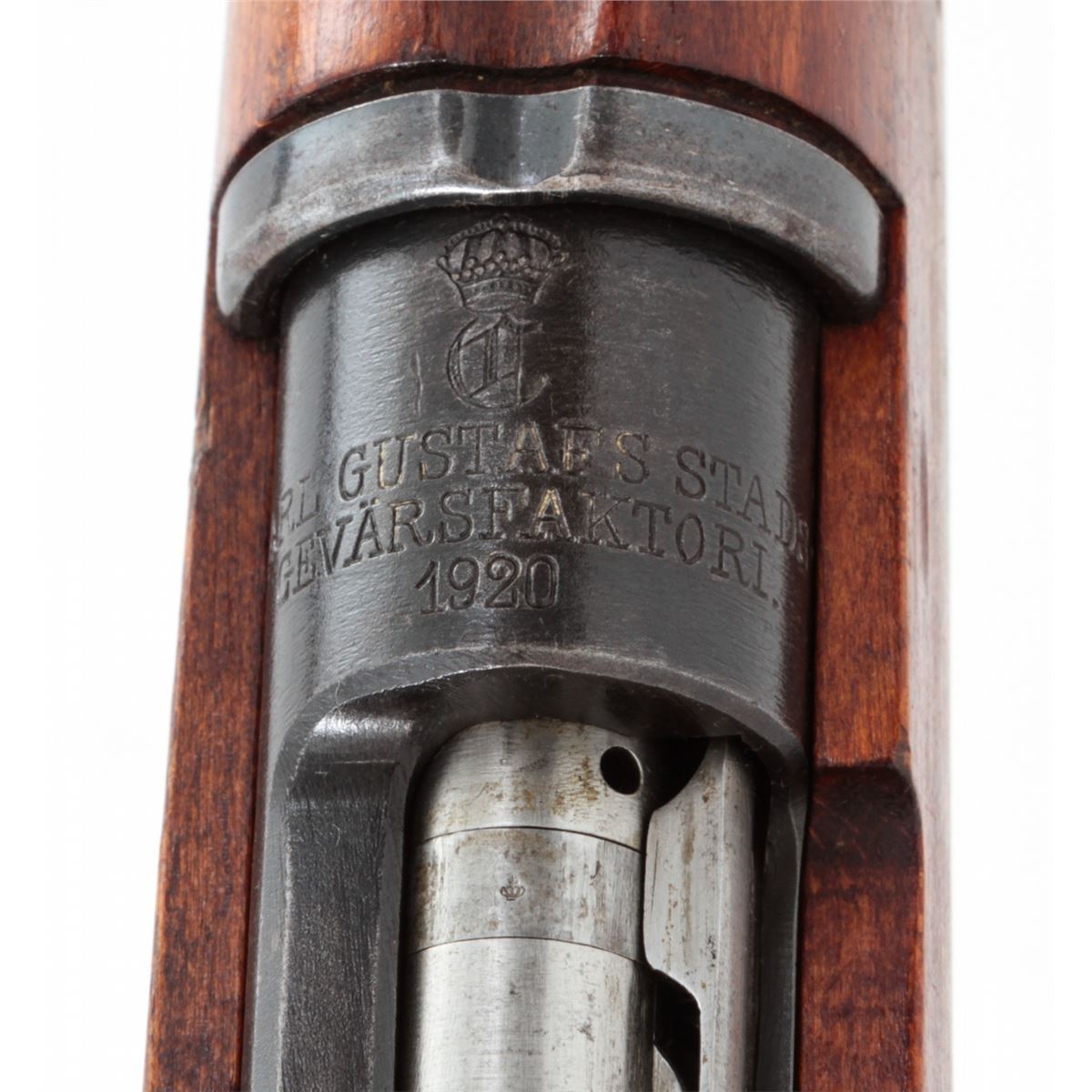 Swedish Model 1896 Bolt Action Rifle, by Carl Gustafs (1920), #489509, 6.5x55 cal., 29'' barrel, blue finish, bright bolt, beech stock with matching numbered buttplate, brass disk showing bore condition of ''1''. Condition is about excellent retaining approx. 94% blue with most of the losses just behind the front sight to top of barrel. Stock with minor scuffs and dings. Crisp action, bright bore. Electric pencil ''509'' marked to left side of bolt head. Lightly import marked. Est.: $300-$500. (C&R)