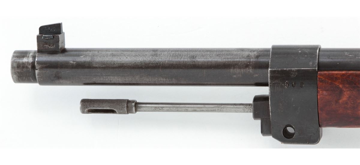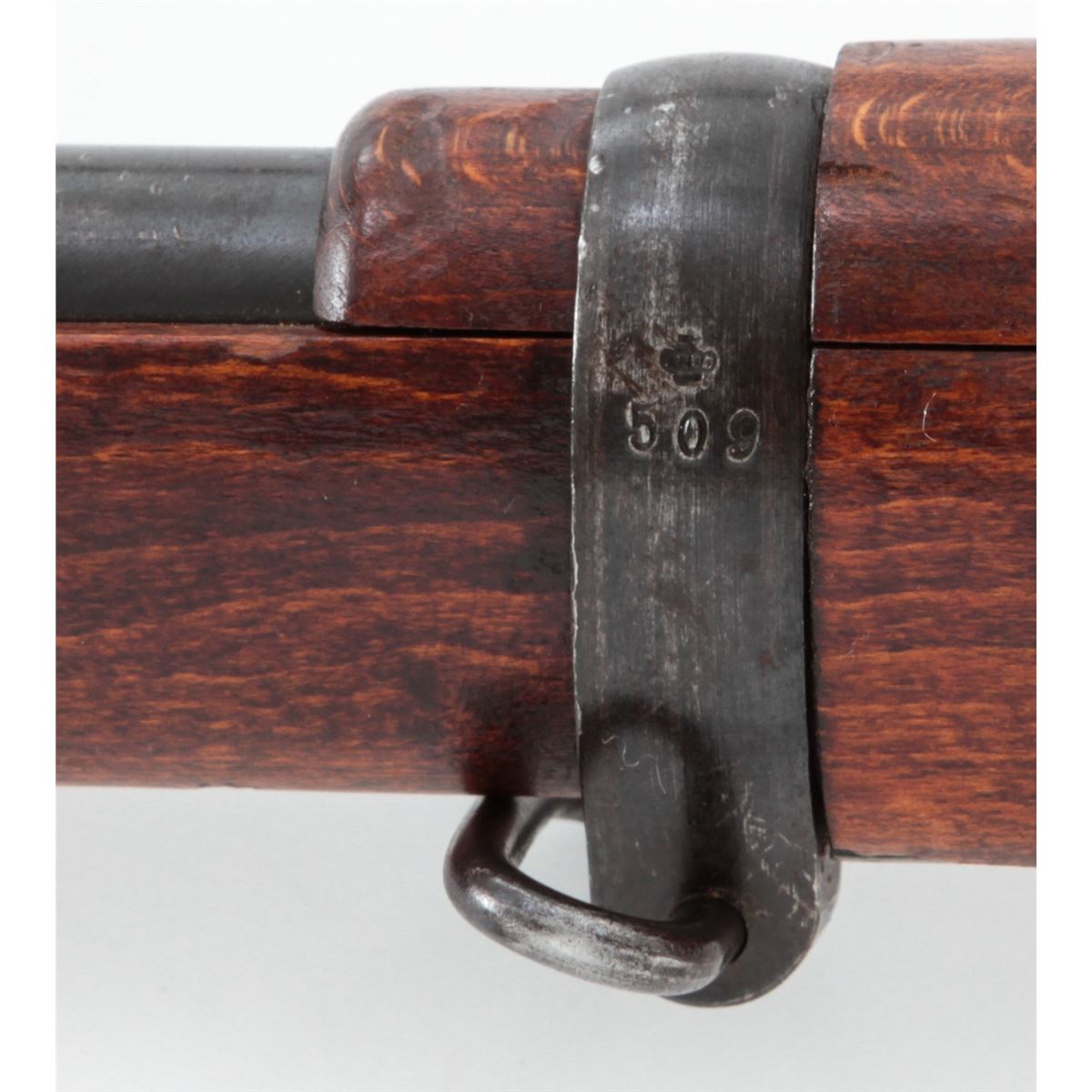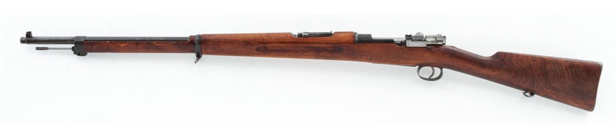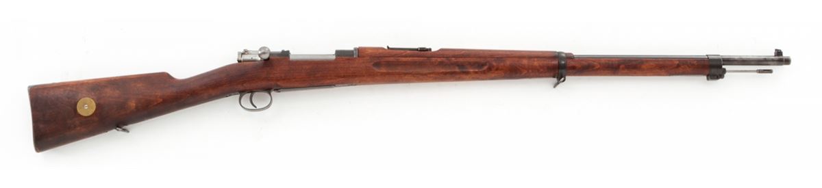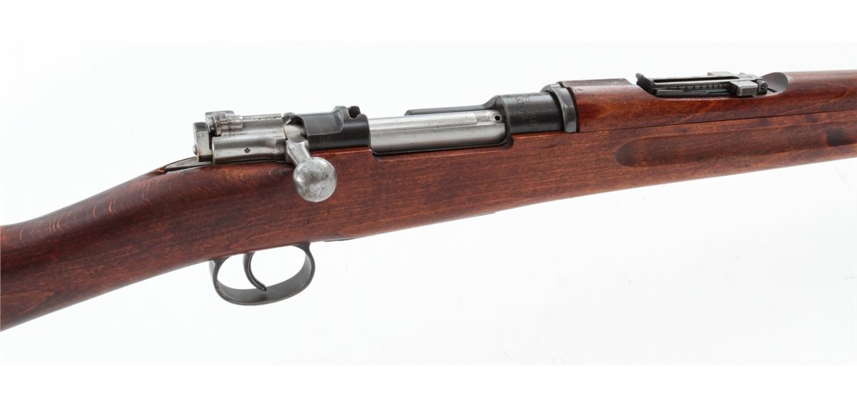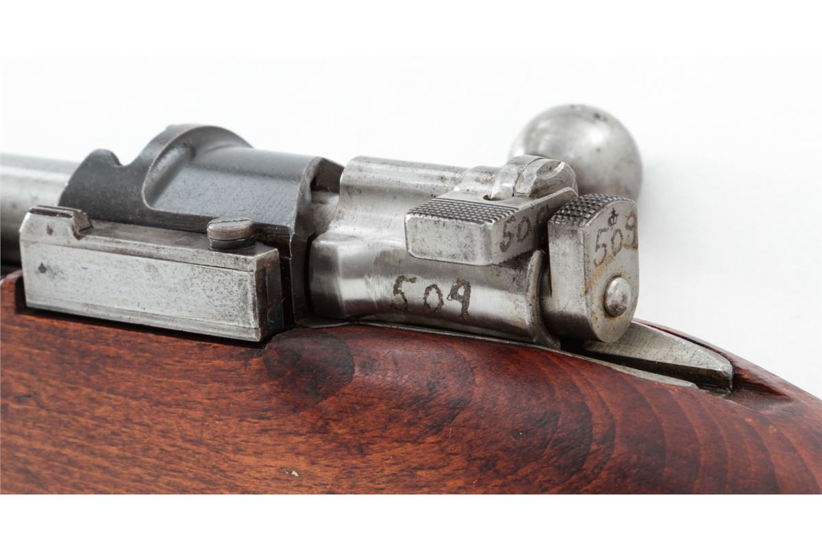 Swedish Model 1896 Bolt Action Rifle, by Carl Gustafs (1920), #489509, 6.5x55 cal., 29'' barrel, blue finish, bright bolt, beech stock with matching numbered buttplate, brass disk showing bore condition of ''1''. Condition is about excellent retaining approx. 94% blue with most of the losses just behind the front sight to top of barrel. Stock with minor scuffs and dings. Crisp action, bright bore. Electric pencil ''509'' marked to left side of bolt head. Lightly import marked. Est.: $300-$500. (C&R)