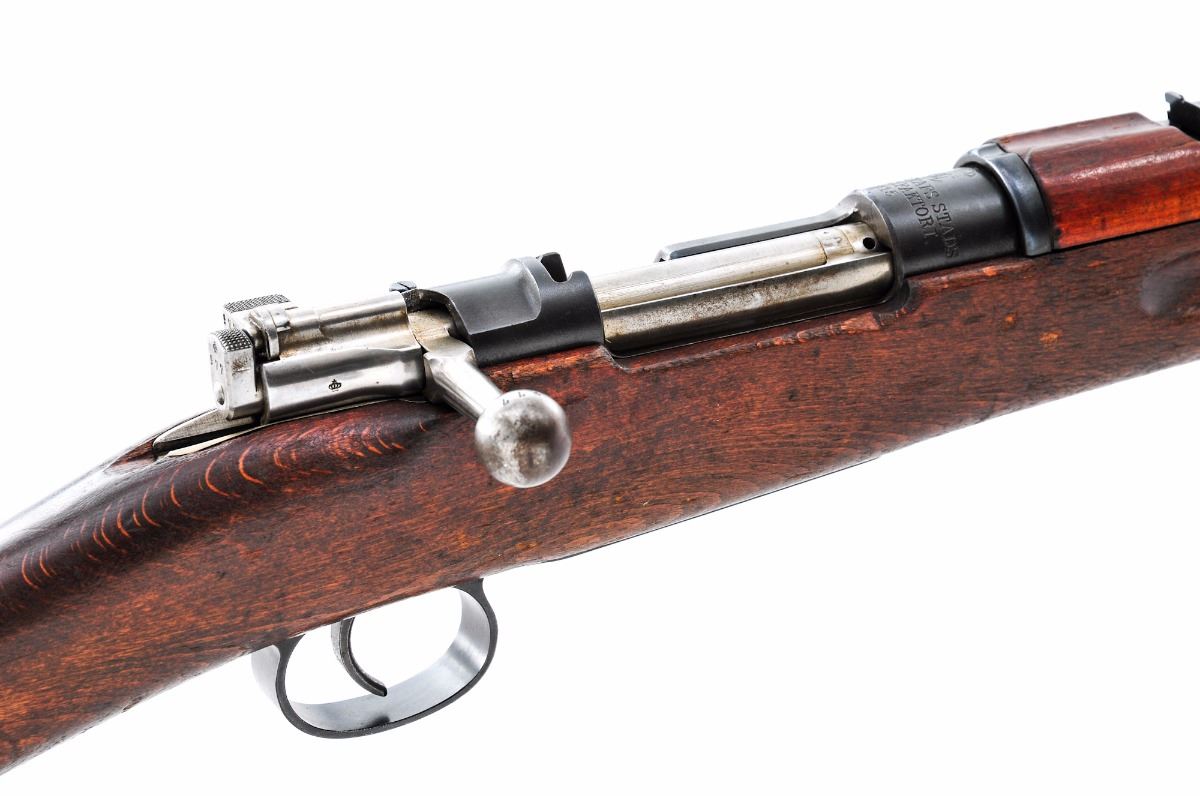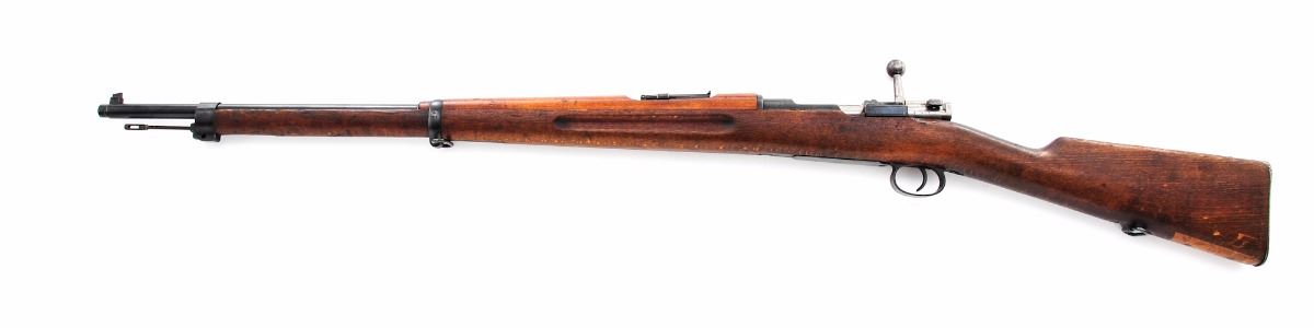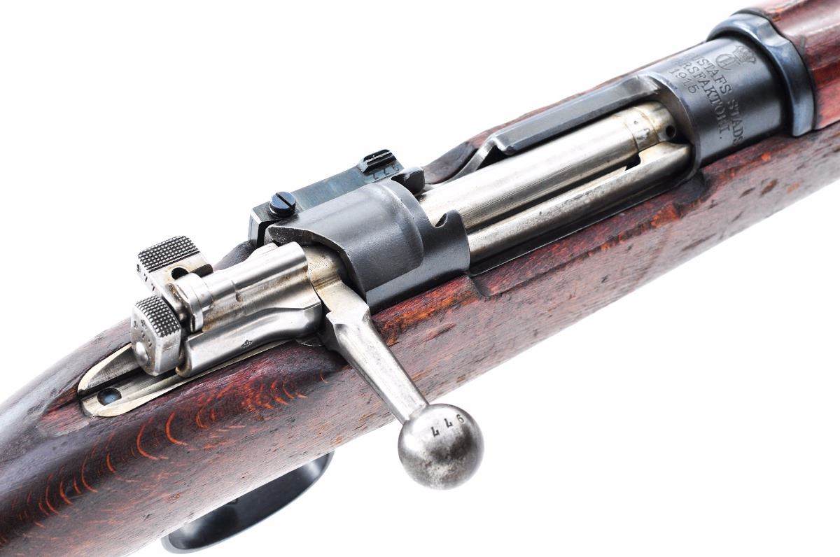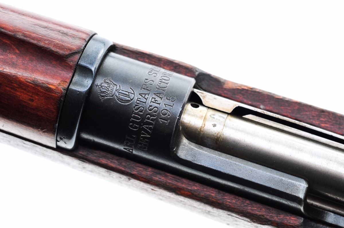 Swedish Model 1896 Bolt Action Rifle, by Carl Gustafs (1915), #369977, 6.5x55mm, 29'' barrel, blue finish, bright bolt, birch stock, with rear sight calibrated from 300-600 meters.  Condition is fine to near excellent with all visible matching numbers.  Stock with arsenal-done repair at heel.  Action is crisp, bore is bright.  Est.:  $450-$600.  (C&R)