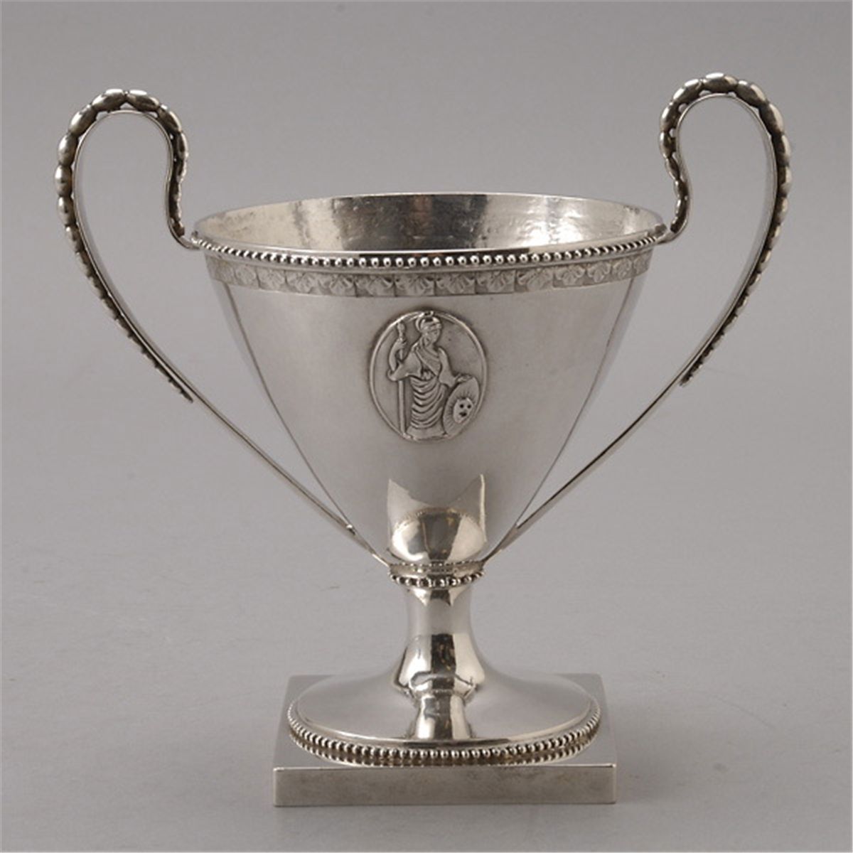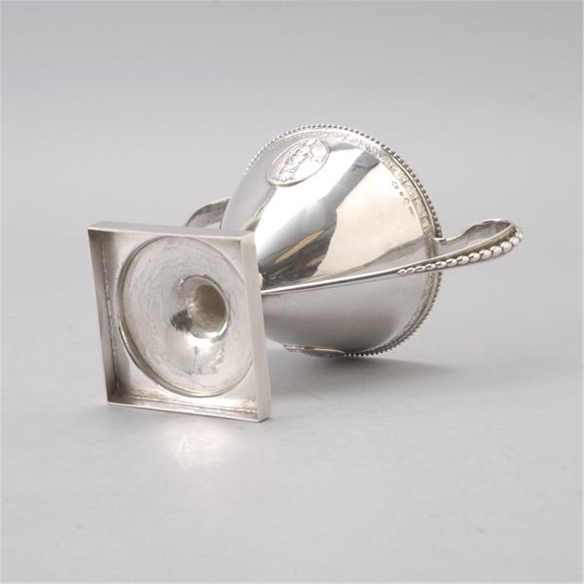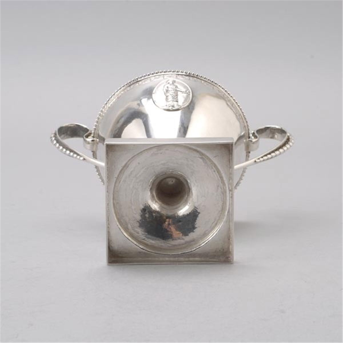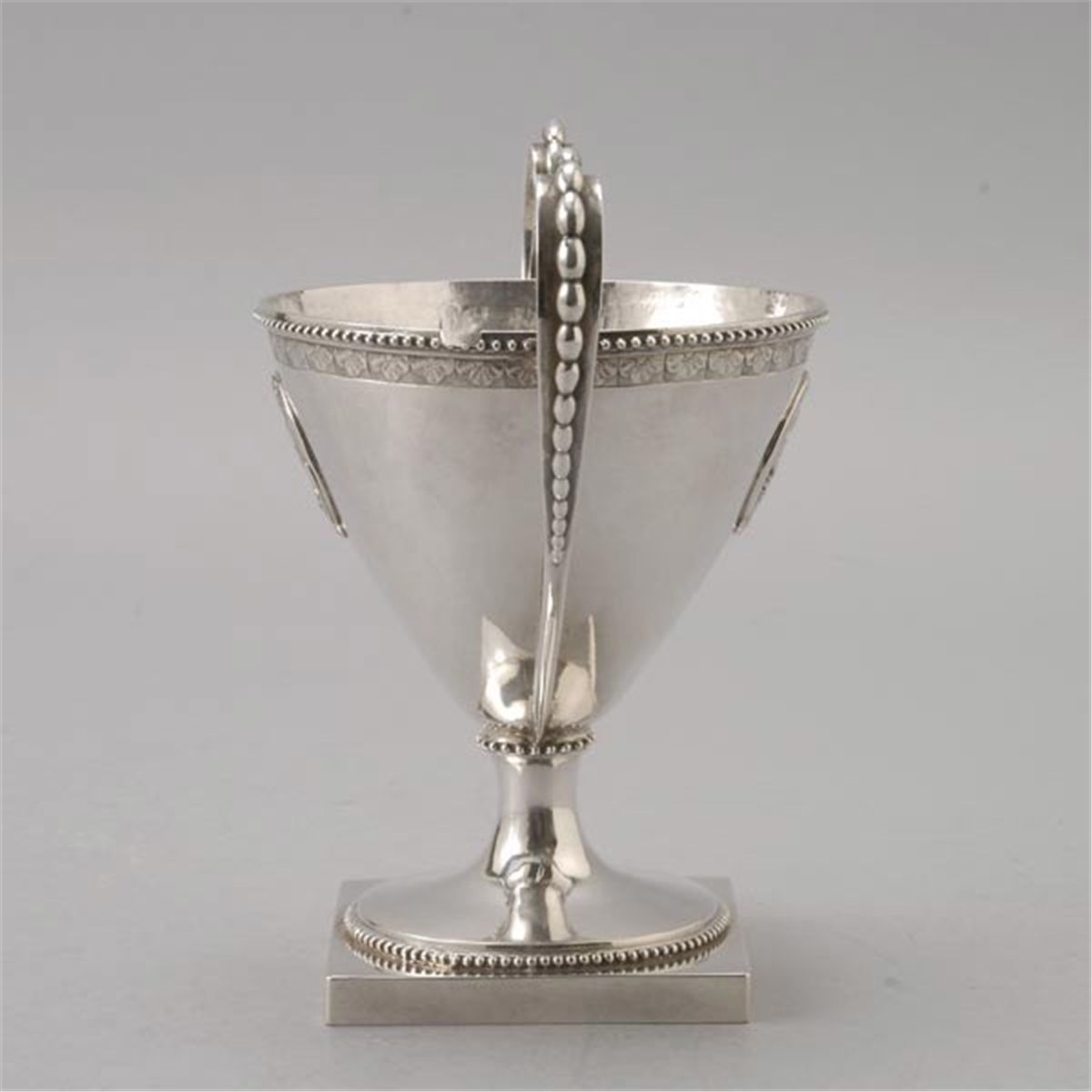 Swedish Neoclassical Medallion Silver Covered Sugar, the conical form cast with an auricular handle with applied blossom lengths, the cover with a berried finial, allover decorated with beaded banding, marked with AFW/crown hallmark/KA {Height 7 inches}