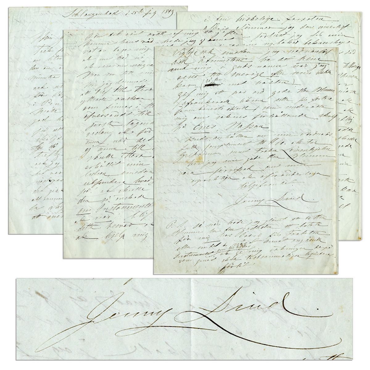 Jenny Lind autograph letter signed, dated 25 July 1849. Letter is written presumably in Swedish and is boldly signed ''Jenny Lind'' with a postscript. Card-style letter on 4pp., front and verso, measures 8.5'' x 10.75'' and bears a blind-stamped seal at upper left.