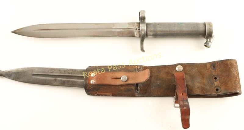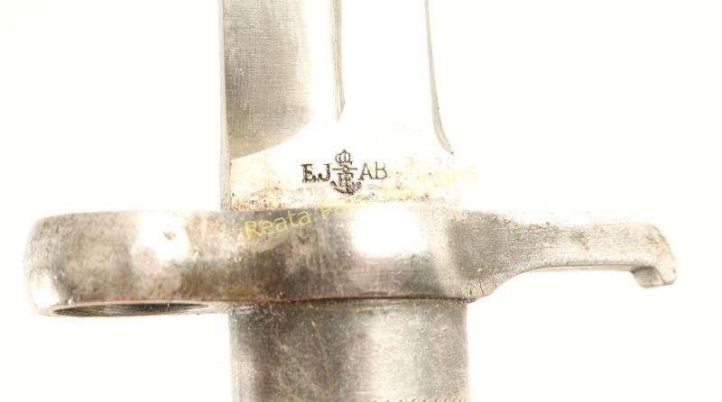 Marked on ricasso 'EJAB' with an anchor and crown and marked '102' on other side with metal sheath and metal hanger stamped with crown. 13"overall with an 8" blade. Foe Mauser rifles and AG42b Ljungman