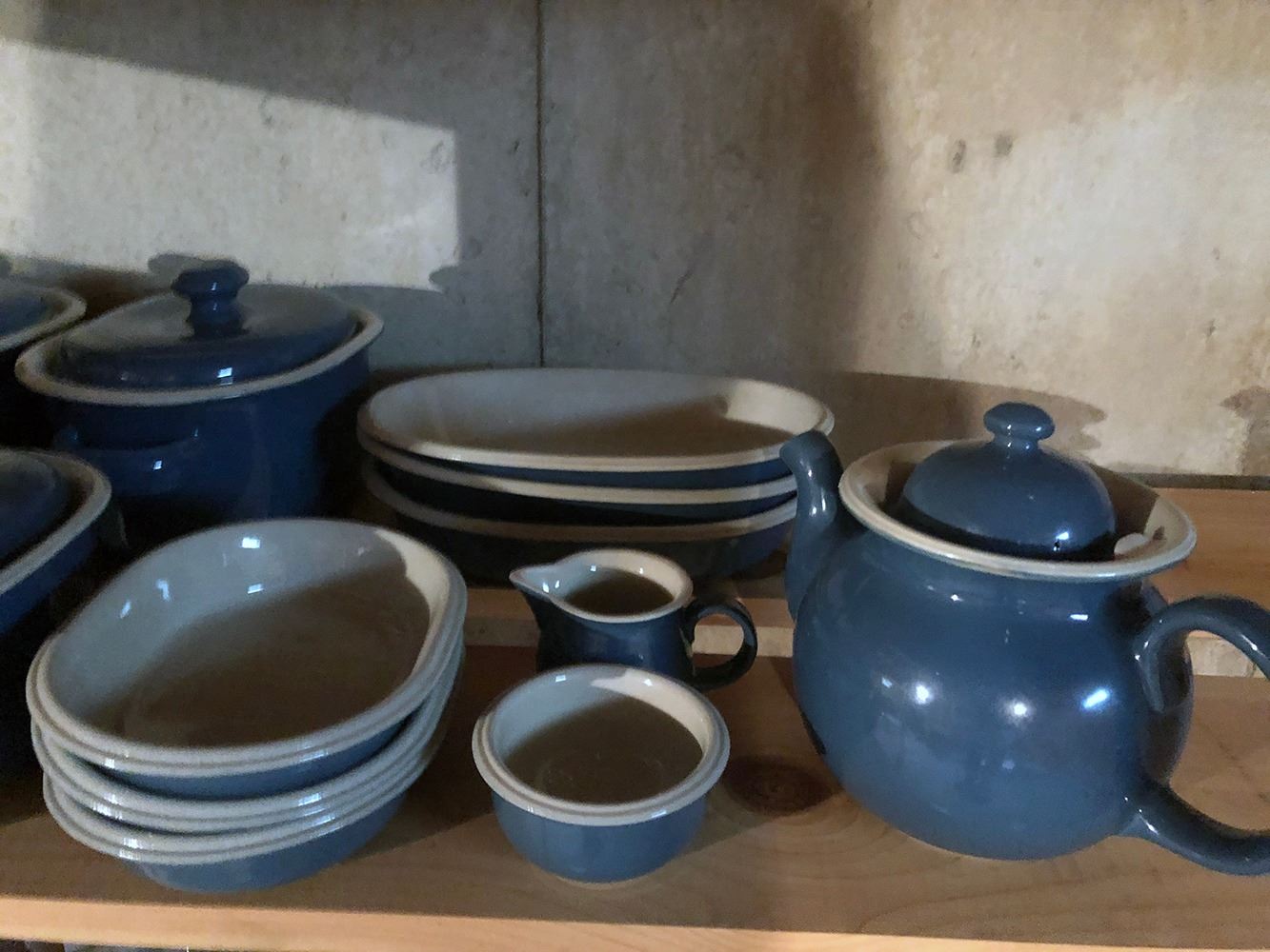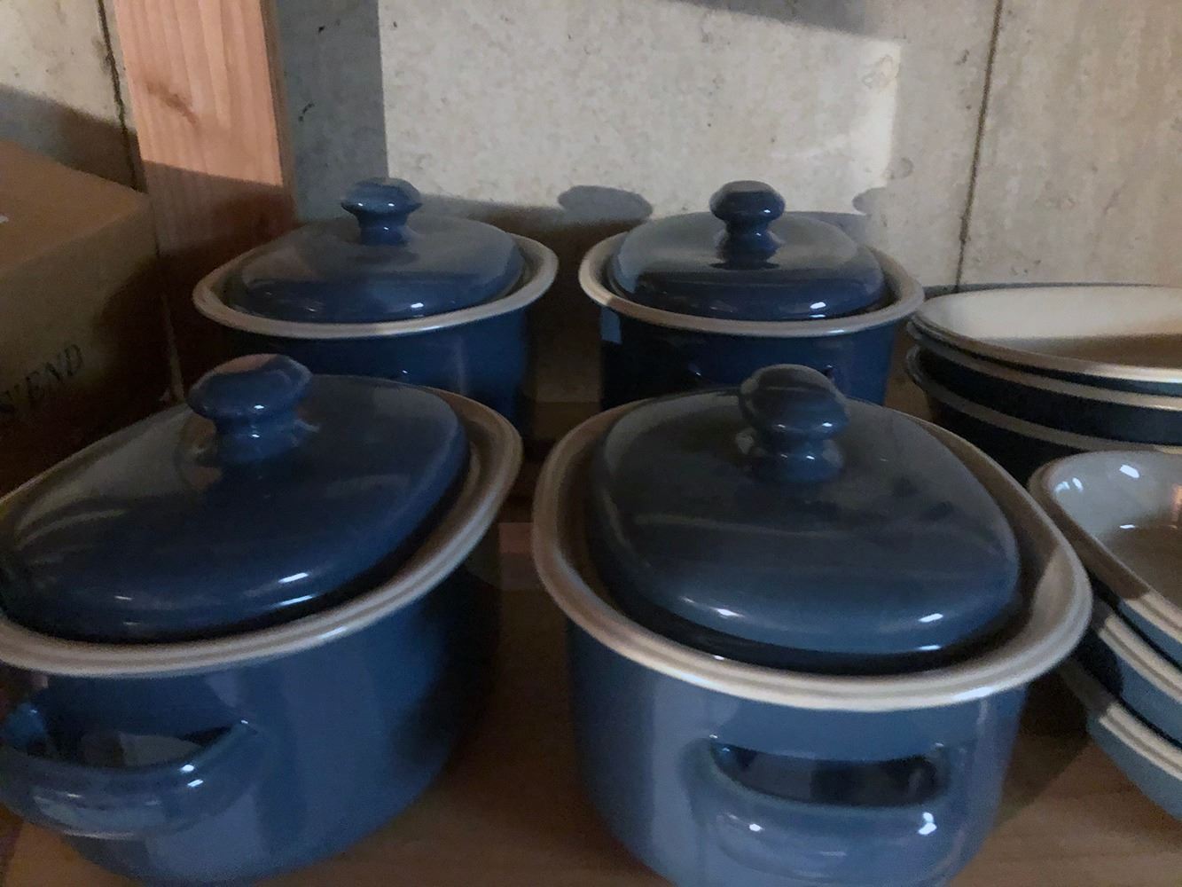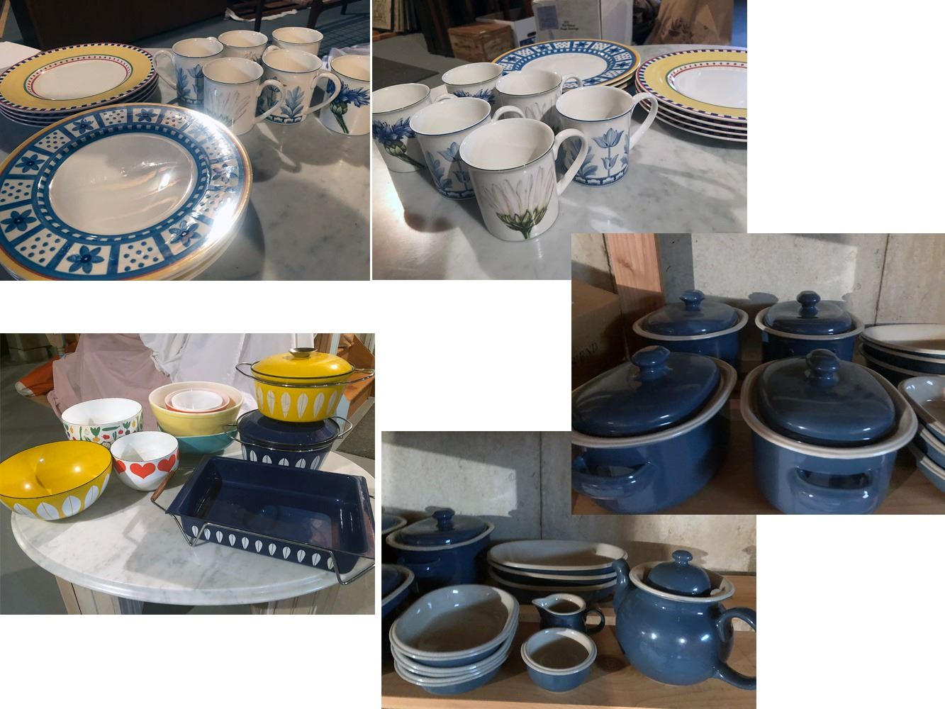 Hoganas, Seden, Keramik Servs 80 Ceramics including 3 small oval casseroles 7.5 inches x 5.75 inches, 3 medium oval casseroles 11.5 inches x 9 inches, 1 teapot with lid, creamer and sugar set, 2 oval covered casseroles; msall with handles 10 inches x 7 inchs x 6.5 inches, large with handles 12 inches x 7 inches x 7.5 inches. Villeroy and Boch 4 Twist Bea dinnerplates, 4 Twist Anna dinnerplates and 6 mugs. c. 1960s Enamelware, Norway, 13.5 inch casserole dish with carry handled caddy, 9.5 inch bowl, small casseroles 8.5 inches with handles, mediu casserole 9.5 inches plus handles, 4 Pyrex assorted bowls, etc.