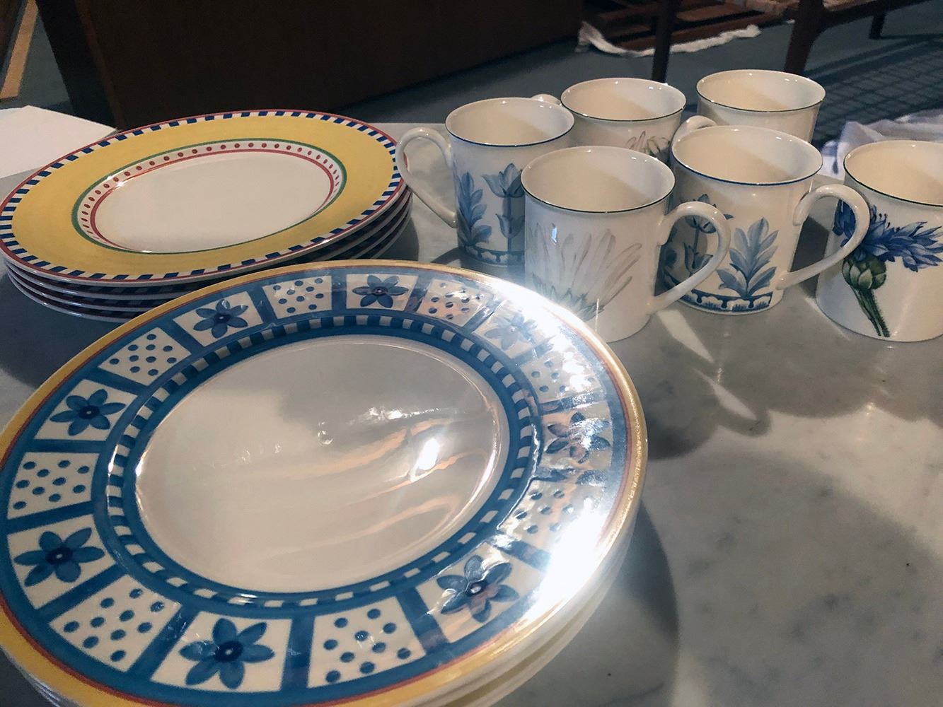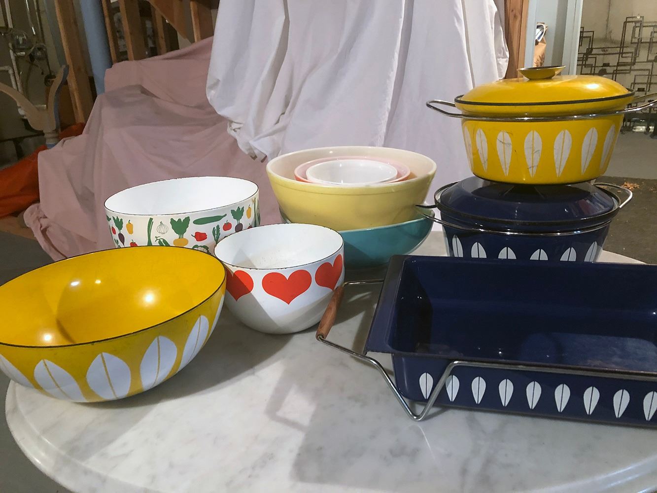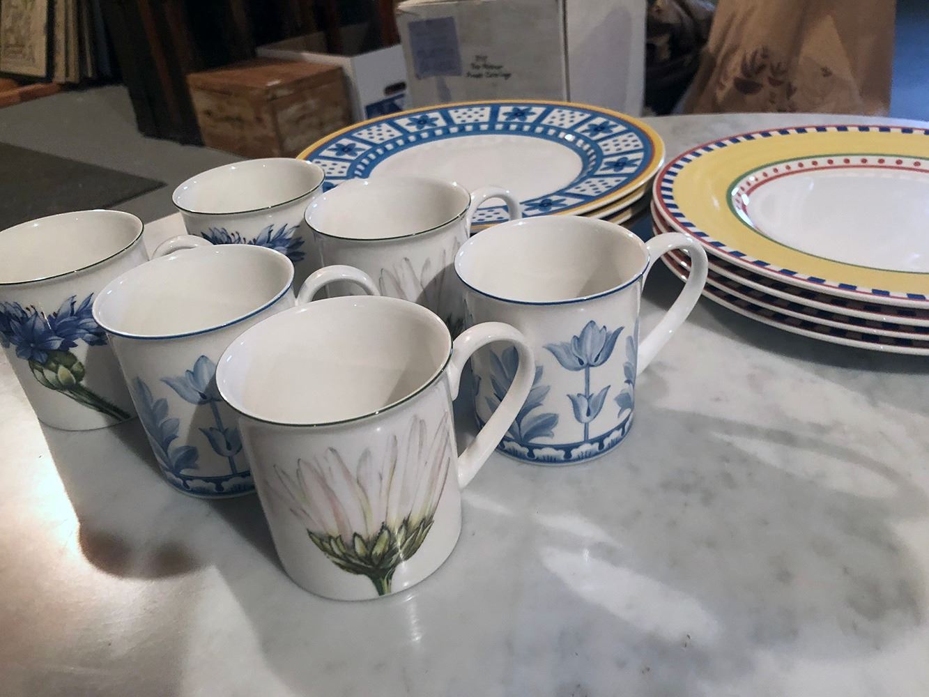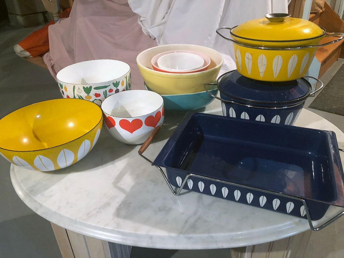 Hoganas, Seden, Keramik Servs 80 Ceramics including 3 small oval casseroles 7.5 inches x 5.75 inches, 3 medium oval casseroles 11.5 inches x 9 inches, 1 teapot with lid, creamer and sugar set, 2 oval covered casseroles; msall with handles 10 inches x 7 inchs x 6.5 inches, large with handles 12 inches x 7 inches x 7.5 inches. Villeroy and Boch 4 Twist Bea dinnerplates, 4 Twist Anna dinnerplates and 6 mugs. c. 1960s Enamelware, Norway, 13.5 inch casserole dish with carry handled caddy, 9.5 inch bowl, small casseroles 8.5 inches with handles, mediu casserole 9.5 inches plus handles, 4 Pyrex assorted bowls, etc.