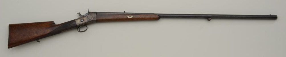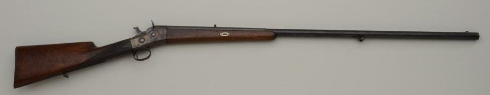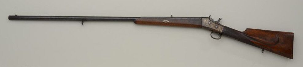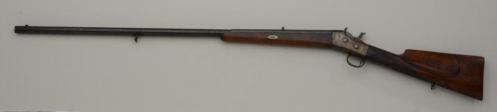 Swedish rolling block 12 gauge shotgun on Remington design with crown and fancy initial marking at breech probably made by Husqvarna. The half-round half-octagon barrel measures 37 ½” overall and the shotgun measures 53 ½” over all. The gun retains approximately 50% to 70% original blue turning brown on barrel with some minor erosion and pinprick pitting just starting up towards the muzzle and breech. The frameshows strong traces of case hardening perhaps as much is 10% within a silvery gray patina. The checkered butt stock is in good condition and forend also is good. The wood shows some dings, mars, scratches with normal use. The hammer shows the Swedish type improved release which is operated on a spring catch. The action is tight and the bore is good. Est.: $400-$800.