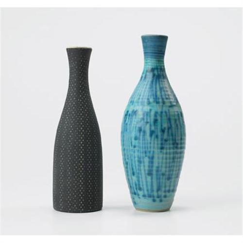 Incised signature to underside of blue vase: [JT]. Signed with stamped manufacturer's mark to underside of brown vase: [Made In Sweden Star-Dust S.202]. <BR><BR>Condition: Blue example is in mint condition. Other example has one small glaze crack to top of lip.