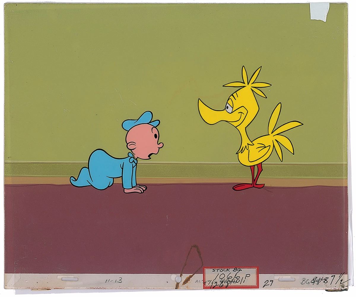 (King Feature Studios, circa 1960s) Original production cel and production background featuring Swee’ Pea from the Popeye TV show, showing the baby crawling next to a big yellow bird. The cel is placed on a hand-painted production background. Images measure 3.5 x 3 and 4 x 4.5, with overall dimensions of 12.5 x 10.5. In fine condition, with some chips to edges of the celluloid.