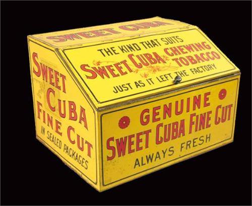 Sweet Cuba Tobacco Store Bin. Fine Cut Chewing Tobacco. Tin. The best condition we have ever seen. Some minor discoloration to bottom left. 18x12x14.