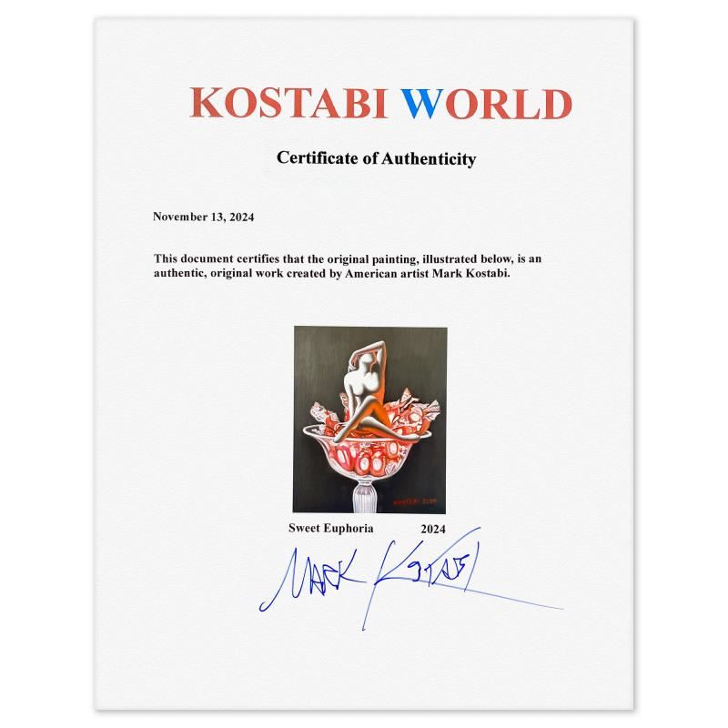 "Sweet Euphoria" is an original oil painting on canvas by Mark Kostabi, hand signed by the artist. This piece comes framed. Includes Certificate of Authenticity. Measures approx. 22" x 20" (frame), 12" x 10" (image). This item requires special handling and may have a longer than usual turnaround.