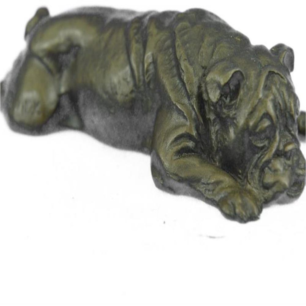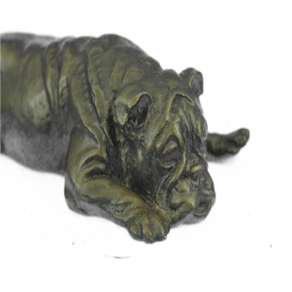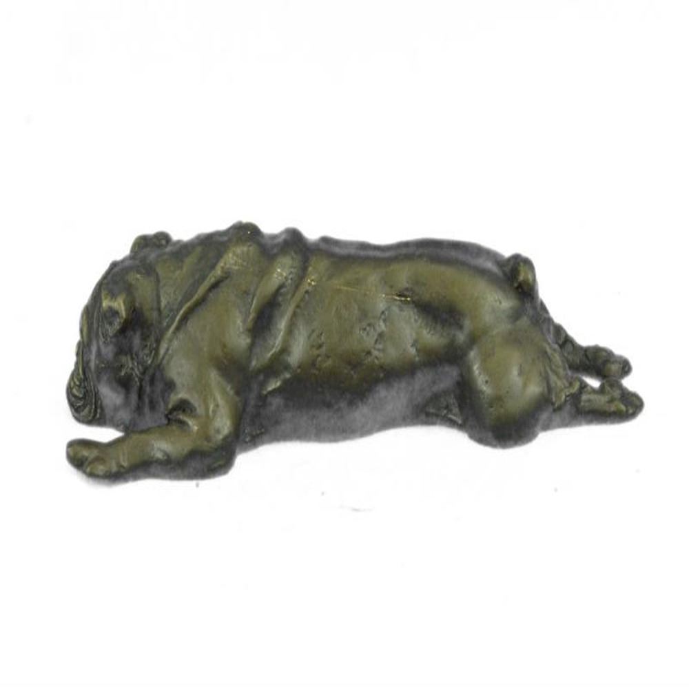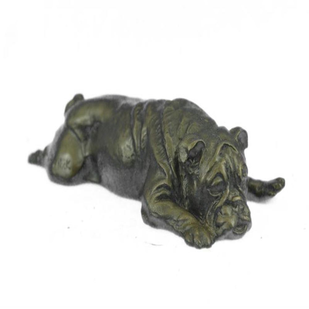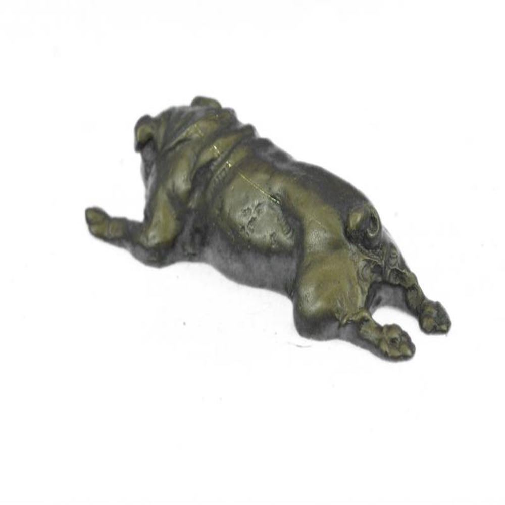 This adorable Bronze Sculpture shows the sweetest little bulldog lying on his belly sprawled out on the marble. With the cutest and very lifelike facial features this Bronze is sure to add a touch of sweetness to your decor. You can see the folds of in his skin on his back as he lays down they look like a ripple effect in water. His short stubby paws are highlighted with bits of gold patina and so is his small curly tail. This is the perfect gift to give to the bulldog owner or lover in your life. This Sculpture was cast using the Lost Wax Method. Bronze Dimensions: Height 2 X Width 7 inches. Weight: 1 LBS.