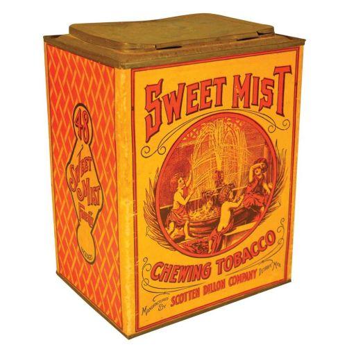 Sweet Mist Chewing Tobacco Cardboard Store Bin with Tin top and Bottom. A few scratches and discoloration otherwise good condition. 8 X 10 X 6 inches.