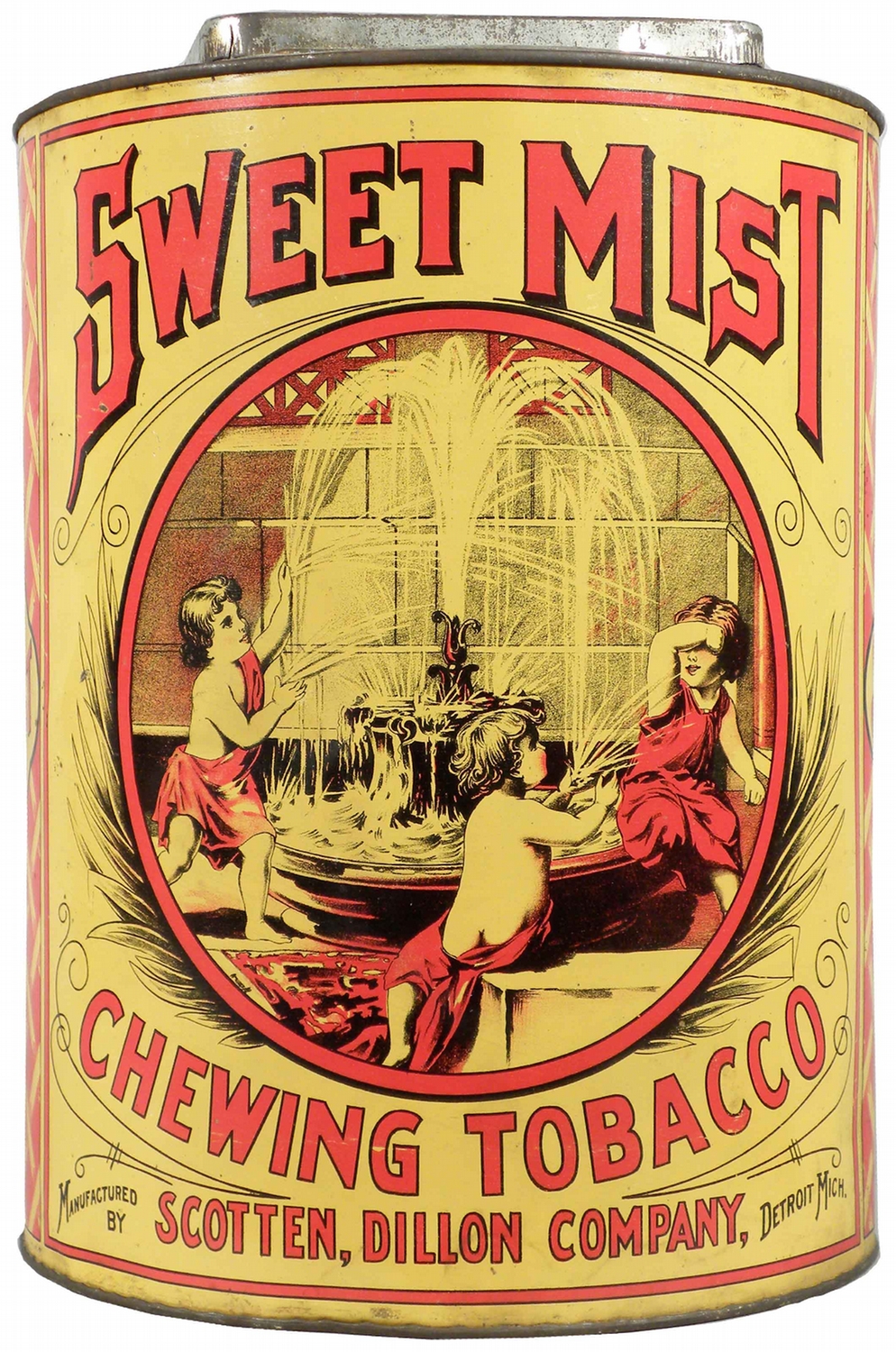 Sweet Mist Chewing Tobacco Tin Store Bin. Scotten, Dillon Company, Detroit, MI. A few minor dents mostly at bottom otherwise very good condition. 8 1/4 inch diameter X 11 inches tall.