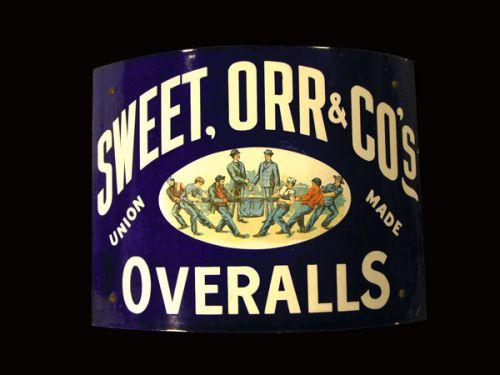 Sweet, Orr and Companies Overalls Union Made Porcelain Sign. If you want a rare porcelain sign then here it is. Multiple colors and it comes with the original back hanging bracket. Excellent original condition with virtually no problems. 17 1/2 X 14 1/4 inches.