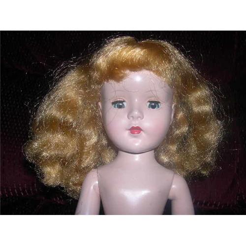 Here is a hard plastic doll from the 1950's. She is a walker as when her legs move, her head turns. She has open and close blue eyes. She has good eyelashes. She has a painted closed mouth. She has her original blonde wig but needs to be reset. I'm sure a little TLC can make her look great on your shelf. She needs a light cleaning. She has no stains or bad odor. She is as I received her. The pants that are on her are American Character made but not sure if they were hers originally. The elastic is stretched out. She is from a smoke free environment. Buyer to pay $15 for shipping, insurance and handling. Thanks for viewing.