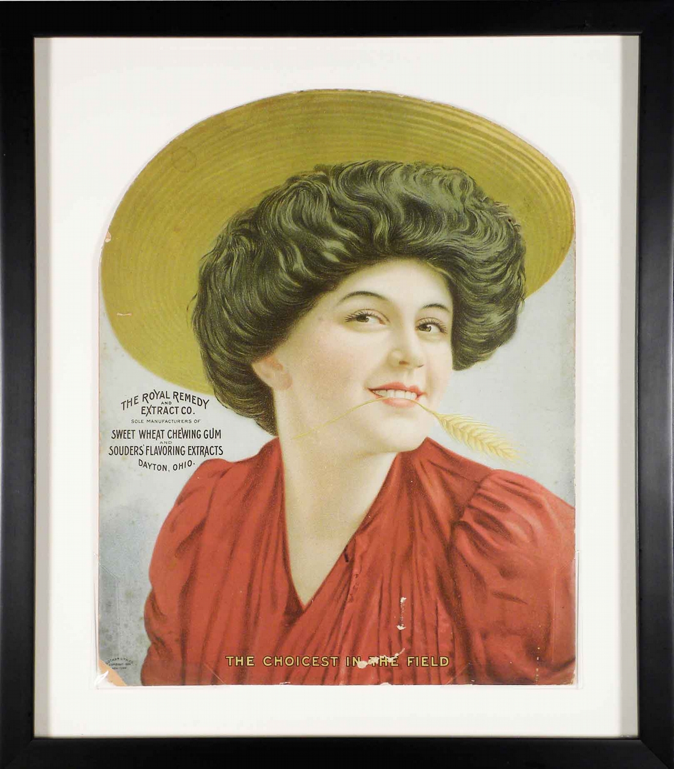 Sweet Wheat Chewing Gum and Souder's Flavoring Extracts Die Cut Cardboard Sign. Entitled, "The Choicest in the Field". The Royal Remedy and Extract Co. sole manufacturers, Dayton, OH. Gotham Litho Co. Copyright 1905, NY. Woman with wheat straw in her mouth. Framed under glass. Minor paper loss on bottom of dress and through lettering and left bottom corner. 10 12 1/2 inches image only.