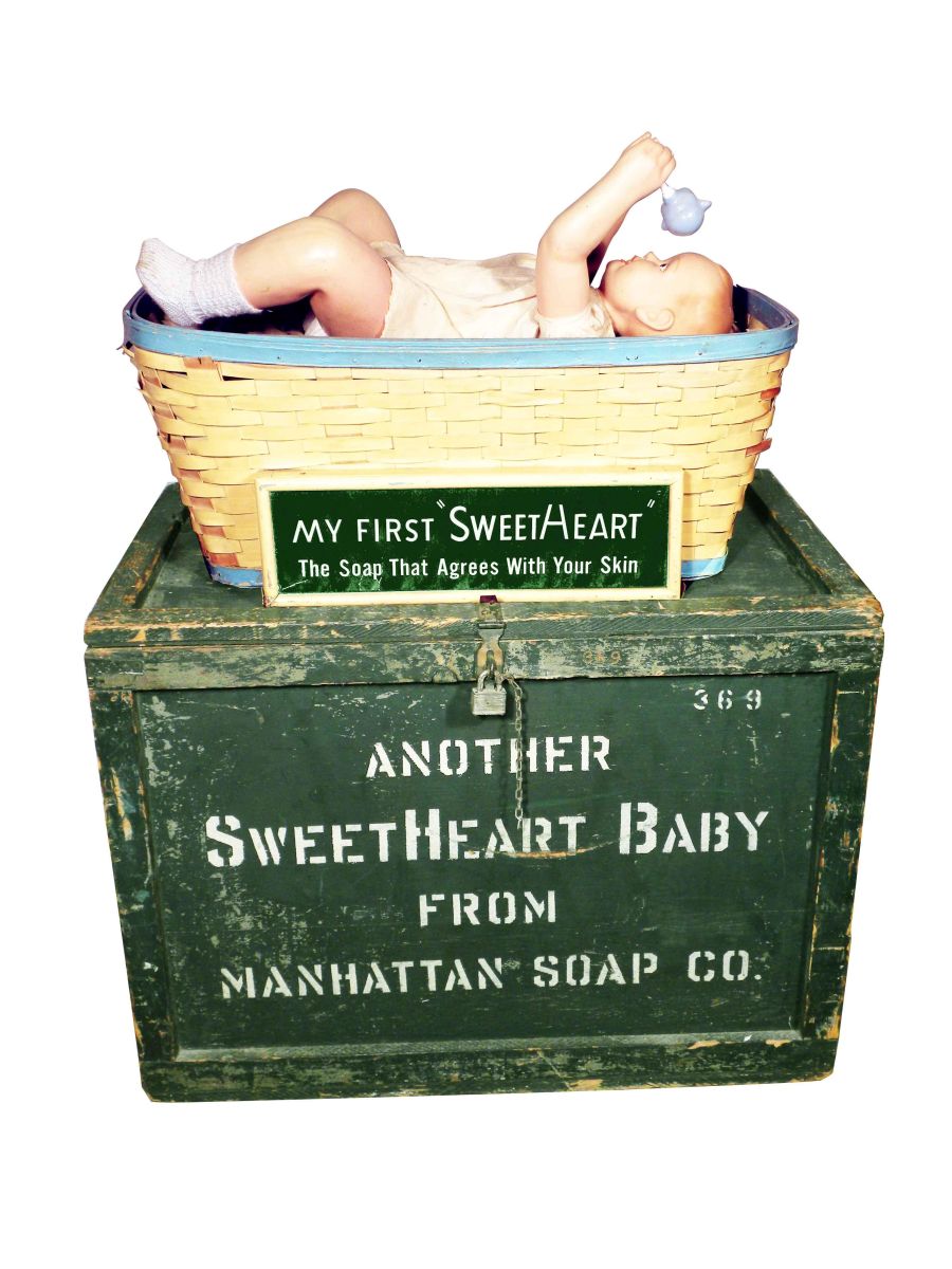 Sweetheart Baby from the Manhattan Soap Company, advertising Sweet Heart Soap. Electrified movement. Comes with some product. The only one we have seen that comes with the original shipping crate. Is missing some fingers on right hand and one glass eye has fallen down into her head otherwise Excellent condition. Baby measures 32 X 20 X 18 inches.