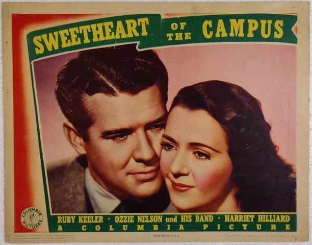 Sweetheart of the Campus (Columbia Pictures, 1941) lobby card. Comedy, Musical, Romance. Starring Ruby Keeler, Ozzie Nelson, Harriet Hilliard, Gordon Oliver, Don Beddoe, Charles Judels, Kathleen Howard, Byron Foulger, George Lessey, Frank Gaby, Zoot Watson. Directed by Edward Dmytryk. Some edge wear, minor creases, paper loss, pin-holes. Very Fine. (11"x14").