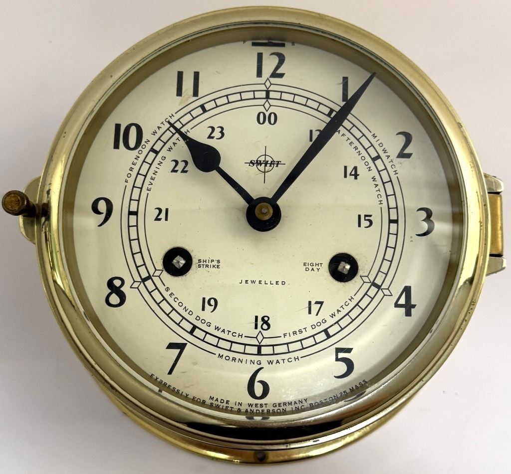 Item/Description: Nautical Maritime 'Morning Watch’ Ship's Bell Clock. Swift & Anderson, Boston Massachusetts, USA. Made in West Germany.