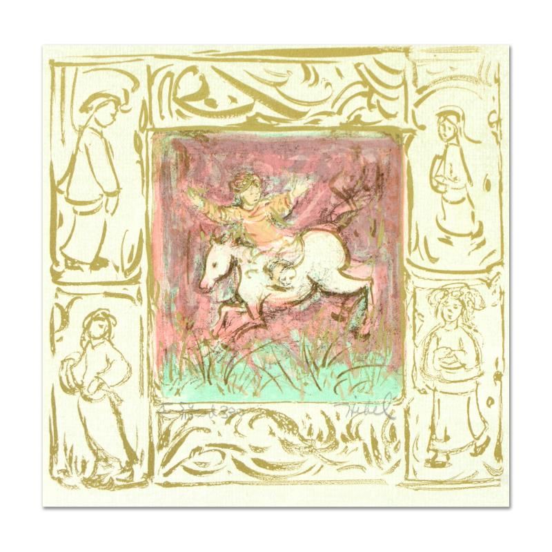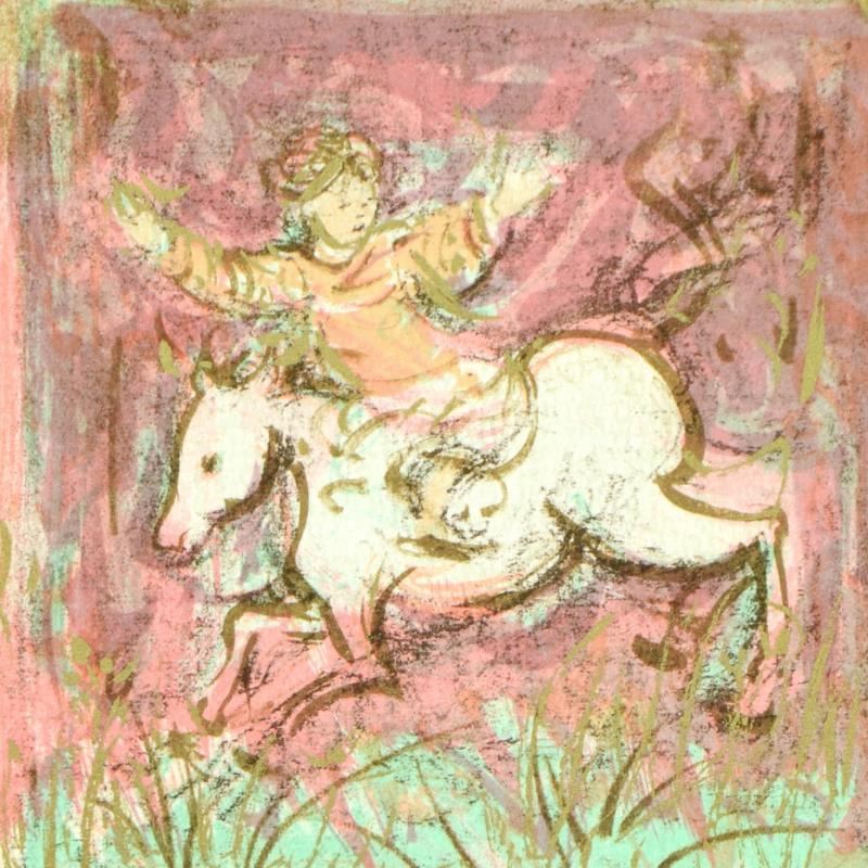 "Swift Rider" is a limited edition lithograph on paper with remarque by Edna Hibel (1917-2014), numbered and hand signed by the artist. Includes Certificate of Authenticity. Measures approx. 7.5" x 7.5" (image).