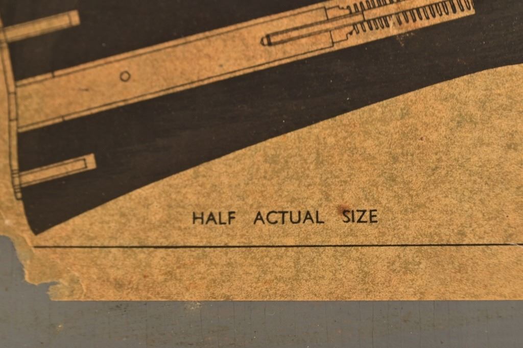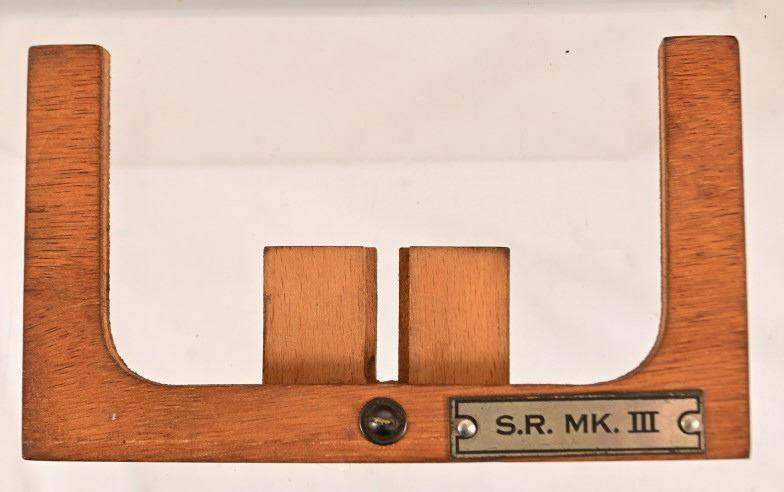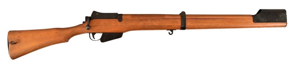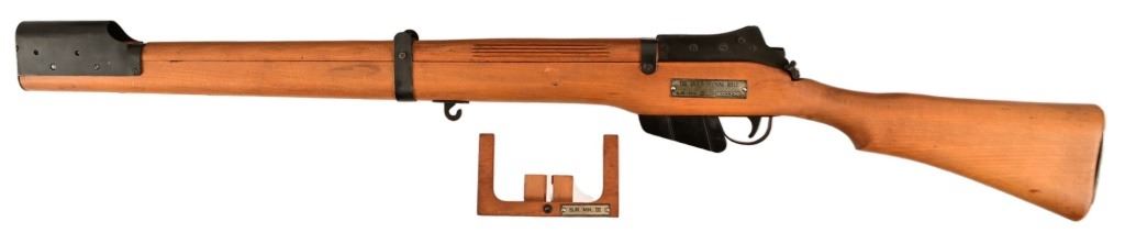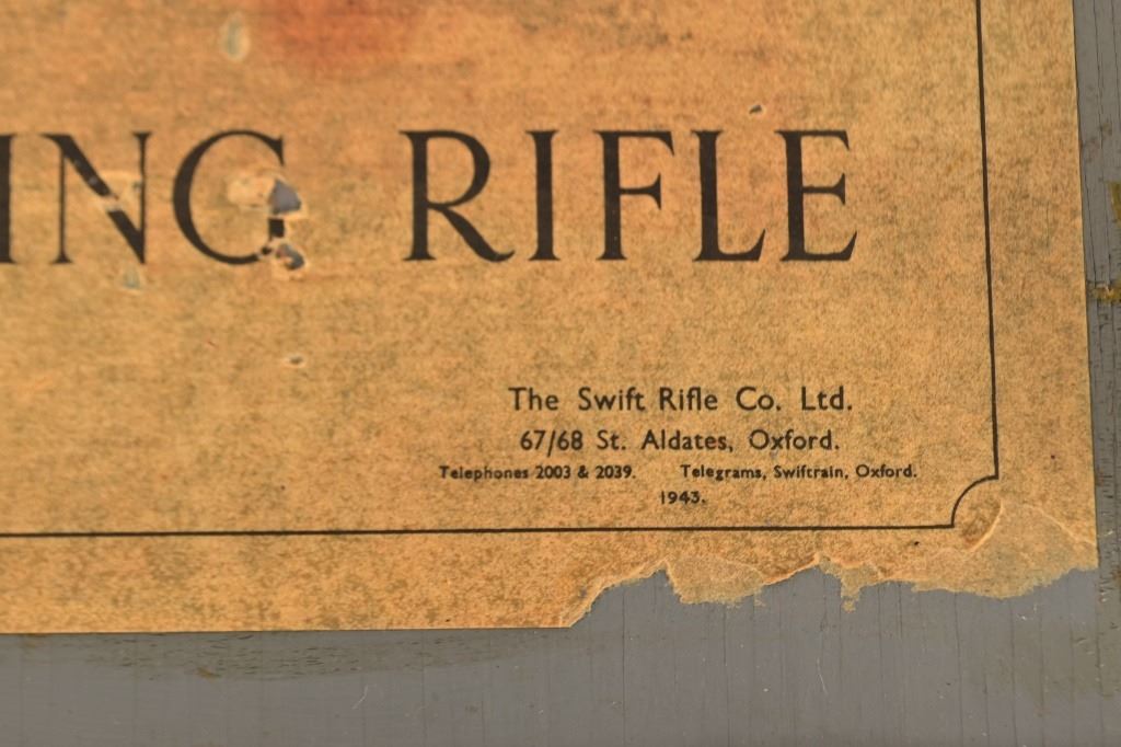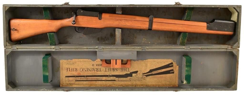 S.R. MK111, 1943 England Frame, in original wood transit chest. Sold mainly to the Royal Air Force to train recruits. This rifle did not actually fire a cartridge, but shot out a forked probe that punctured a paper target barely an inch from the "muzzle".