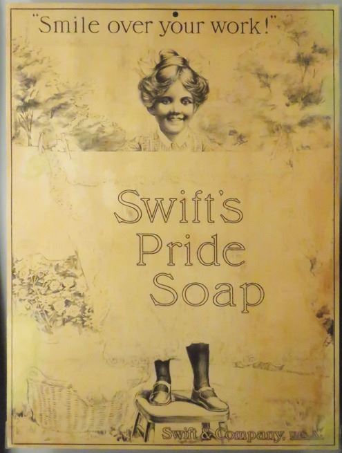 Swift's Pride Soap Cardboard Poster. Repairs and restoration around perimeter. Framed under glass to display both sides. 15 X 20 inches.