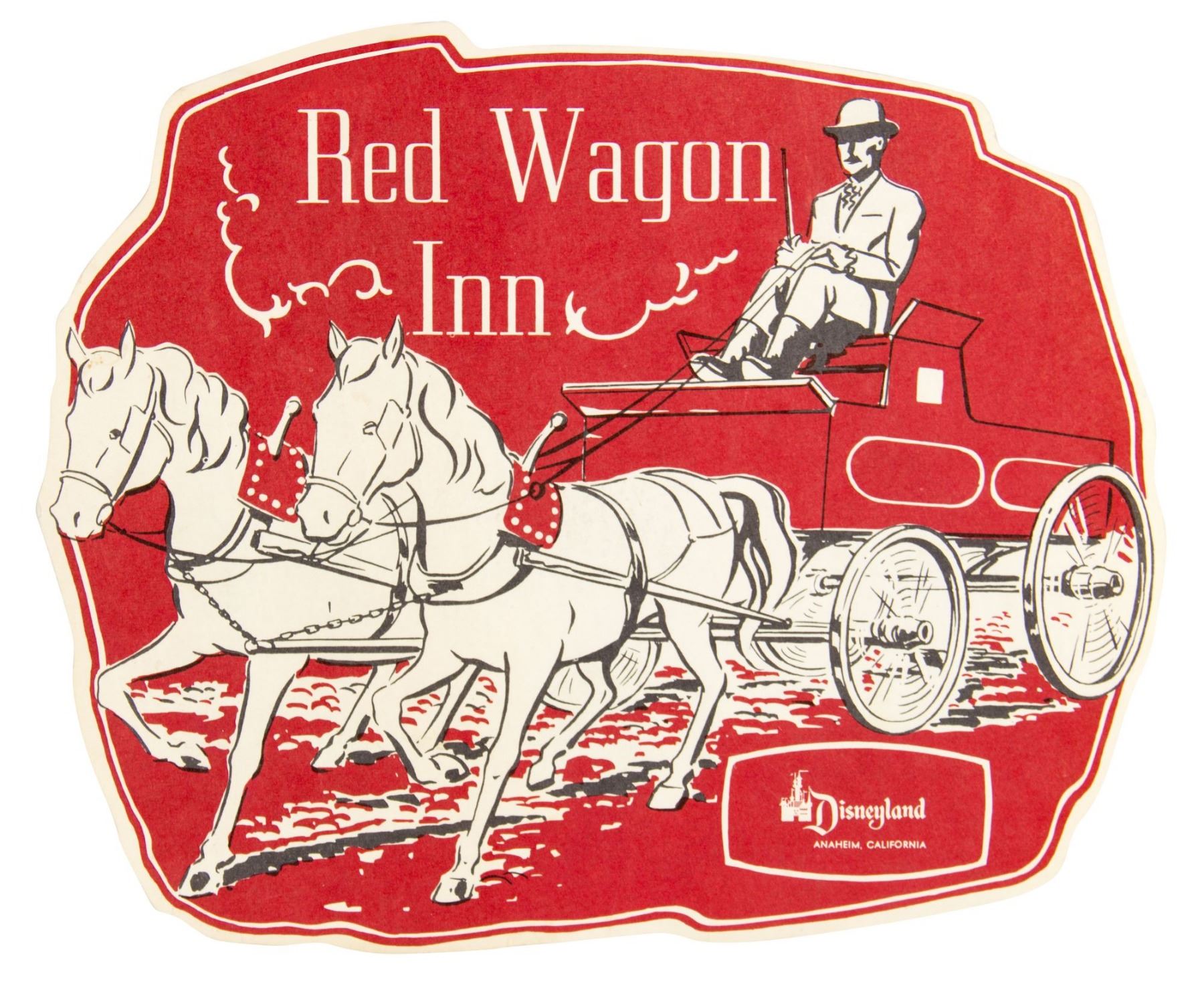 (Disneyland, 1959) A rare die-cut child's menu from Swift's "Red Wagon Inn". The front has beautiful red and white imagery of a Main Street horse-drawn carriage. This menu measures 7.75"x9.25" and is in good condition with some small spots of discoloration on the back.