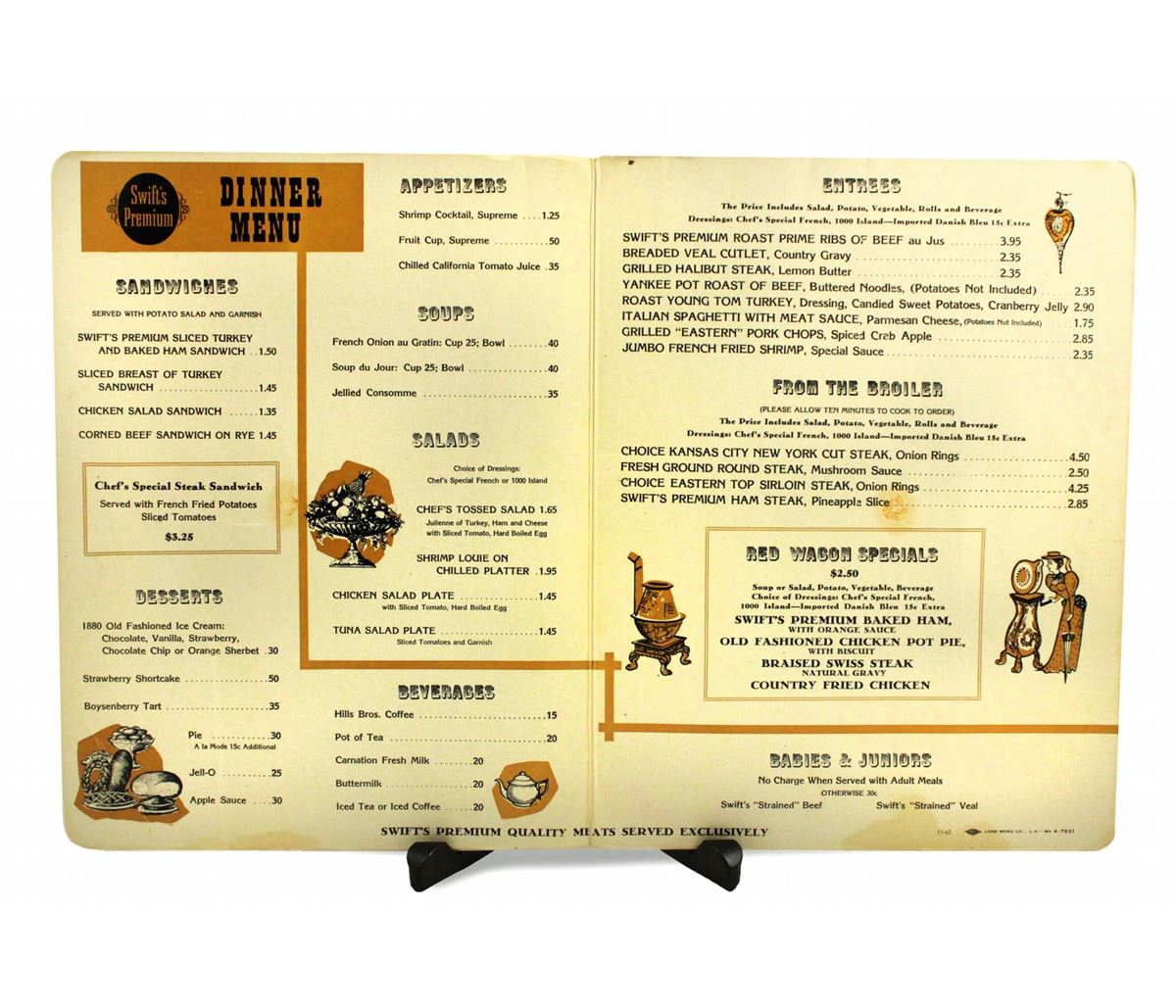 (Disneyland, 1963) A rare 12.5 x 9.5 in. dinner menu for the Swift’s Red Wagon Inn. In very good condition.