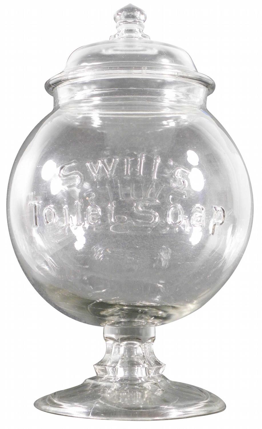 Swift's Toilet Soap Embossed Glass Store Jar with lid. No chips or cracks. Excellent condition. 16 1/2 inches tall X 9 inch diameter.