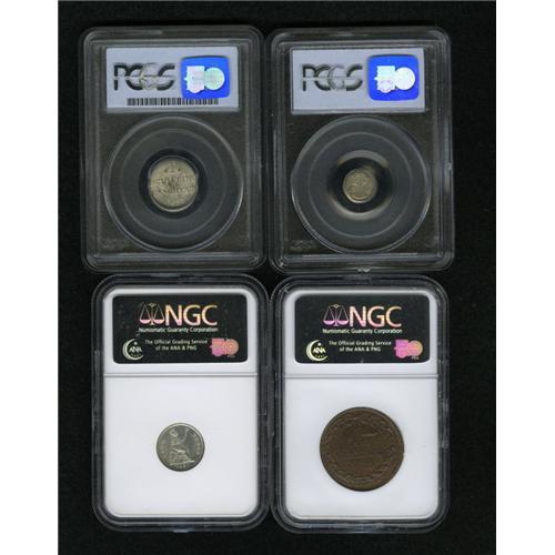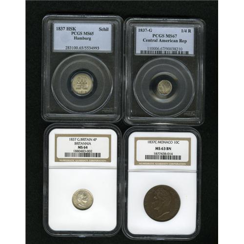 <B>Swift slabs:</B></I>Monaco copper 10c 1837-C MS63 BN NGC, Central American Republic Quarter Real 1837-G MS67 PCGS (whoa!), England Britannia Groat 1837 MS64 NGC, and Hamburg 1 Schilling 1837-HSK MS65 PCGS.<BR><BR><b>Shipping:</b> Coin/Currency (<a target="_blank" href="http://www.heritageauctions.com/common/shipping.php">view shipping information</a>)