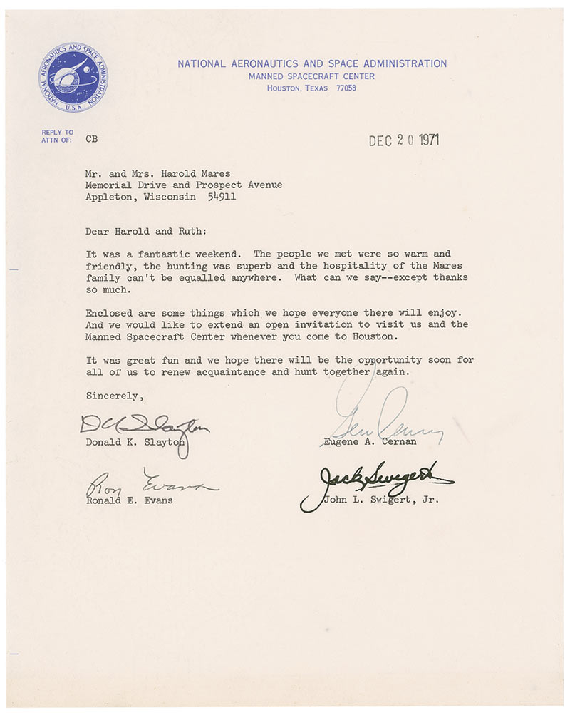 TLS, one page, 8 x 10, NASA letterhead, stamp-dated December 20, 1971. Letter of thanks to Mr. and Mrs. Harold Mares in Wisconsin. In part: “It was a fantastic weekend. The people we met were so warm and friendly, the hunting was superb and the hospitality of the Mares family can’t be equalled anywhere. What can we say–except thanks so much.…We would like to extend an open invitation to visit us and the Manned Spacecraft Center whenever you come to Houston.” Signed at the conclusion in ballpoint and ink by Deke Slayton, Gene Cernan, Ron Evans, and Jack Swigert. In fine condition.