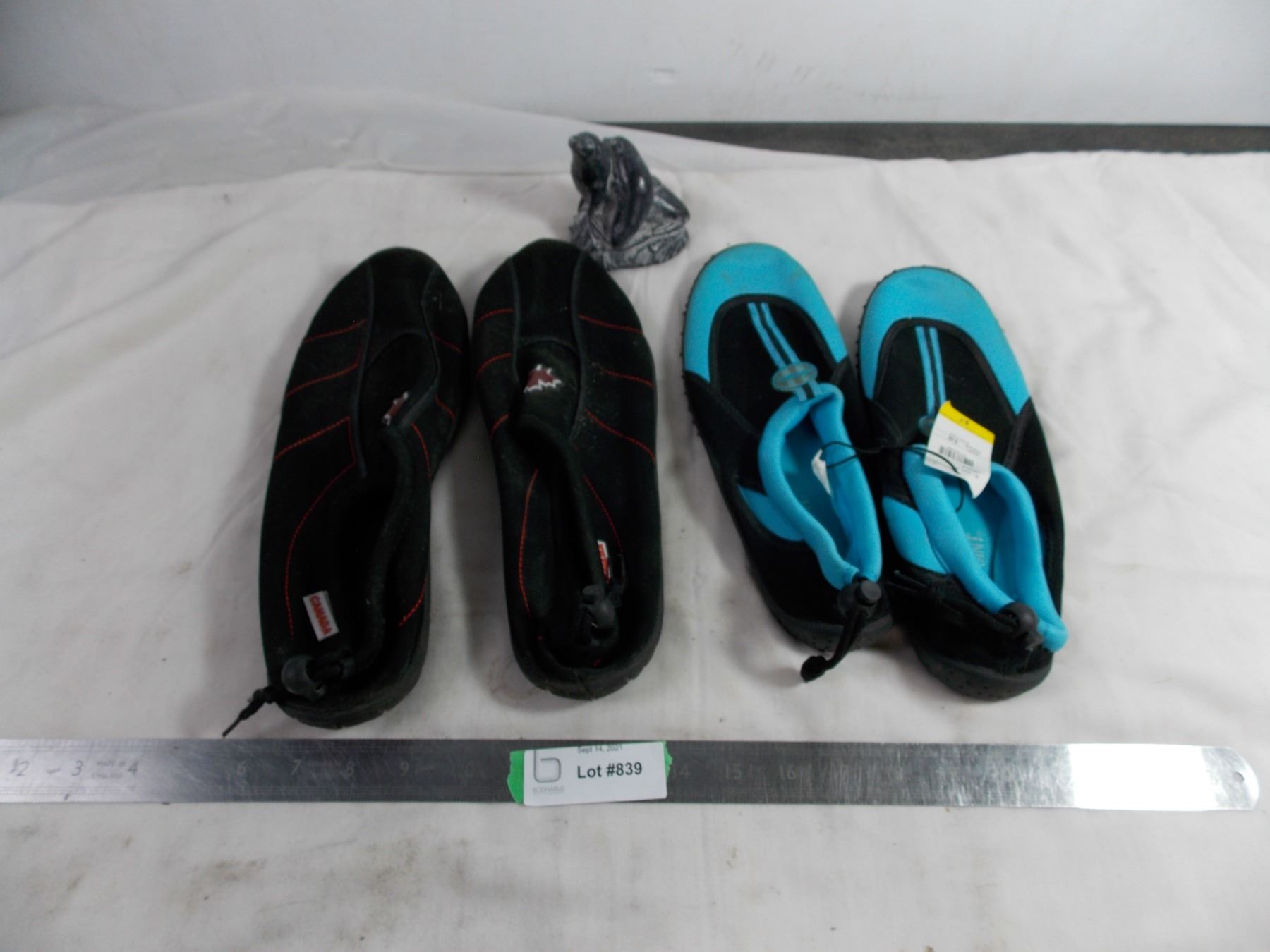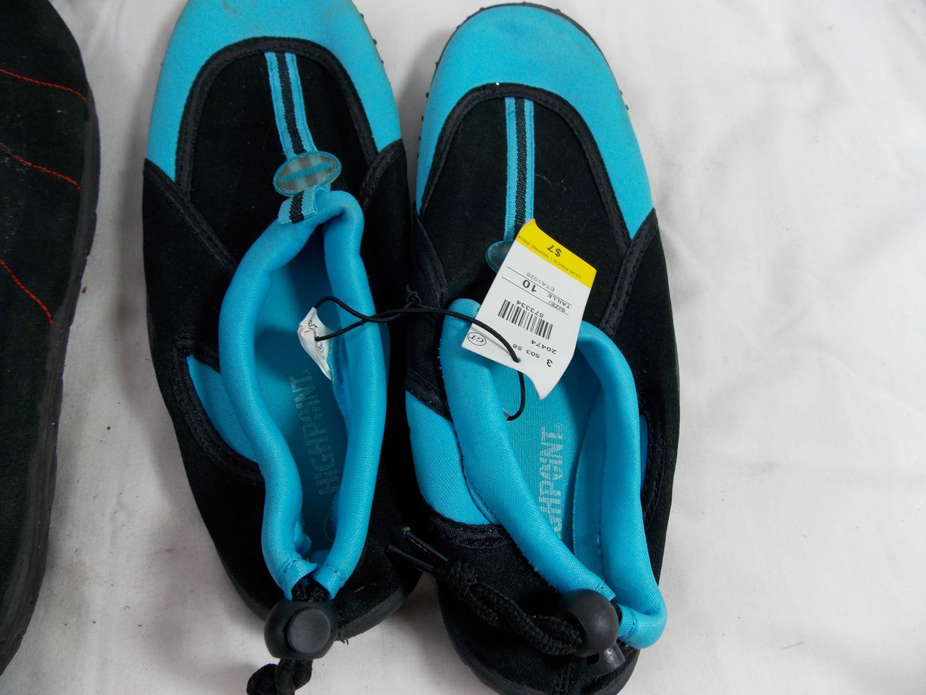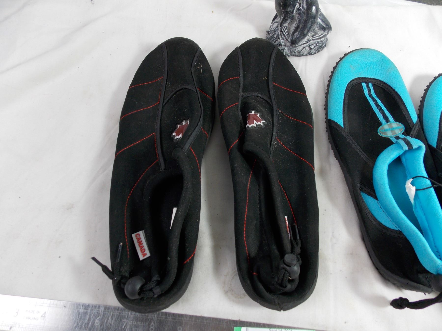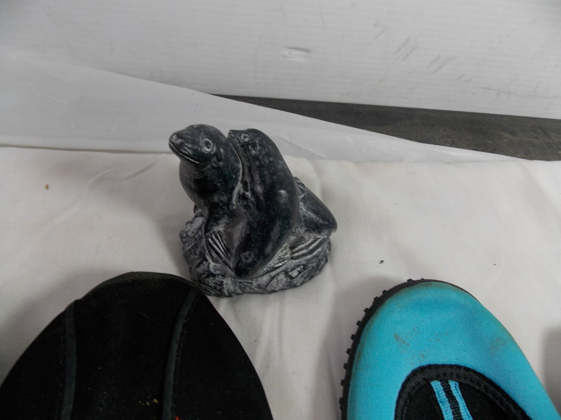 Swim shoes, black size 11, blue size 10 + seals tiny statue