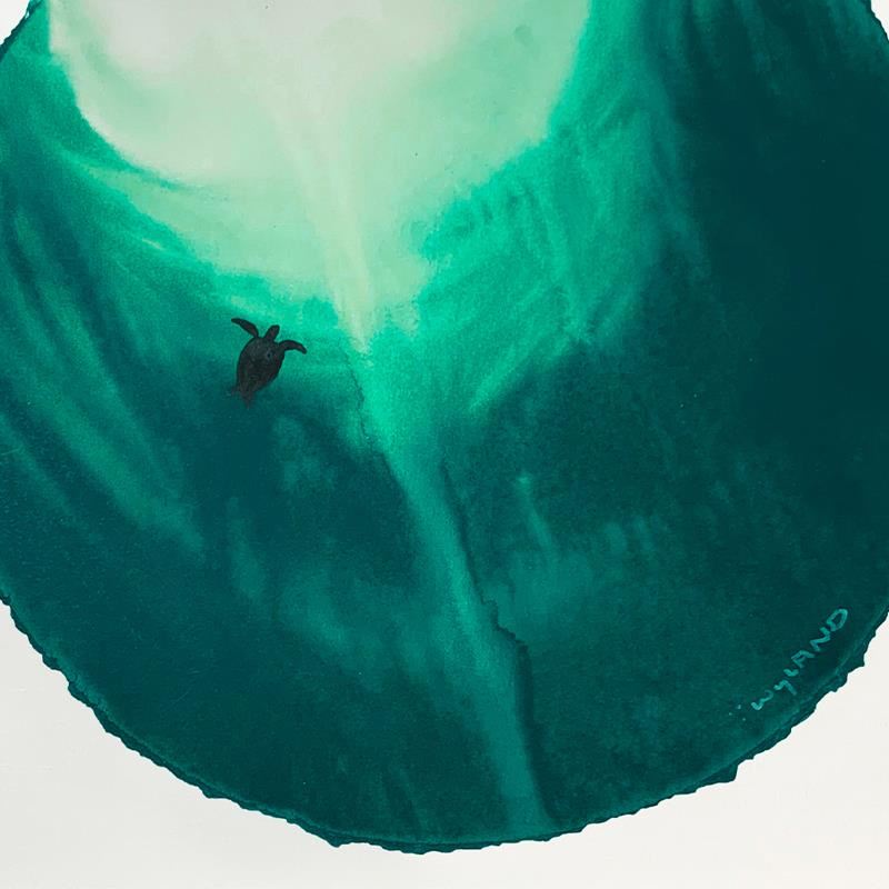 "Swimming in a deep green sea" is an original painting, watercolor on deckle edge paper by Wyland. Hand signed by the artist, the piece comes custom framed and with a letter of authenticity. Measures approximately 30" x 30" (framed), 19.5" x 19.5" (image).