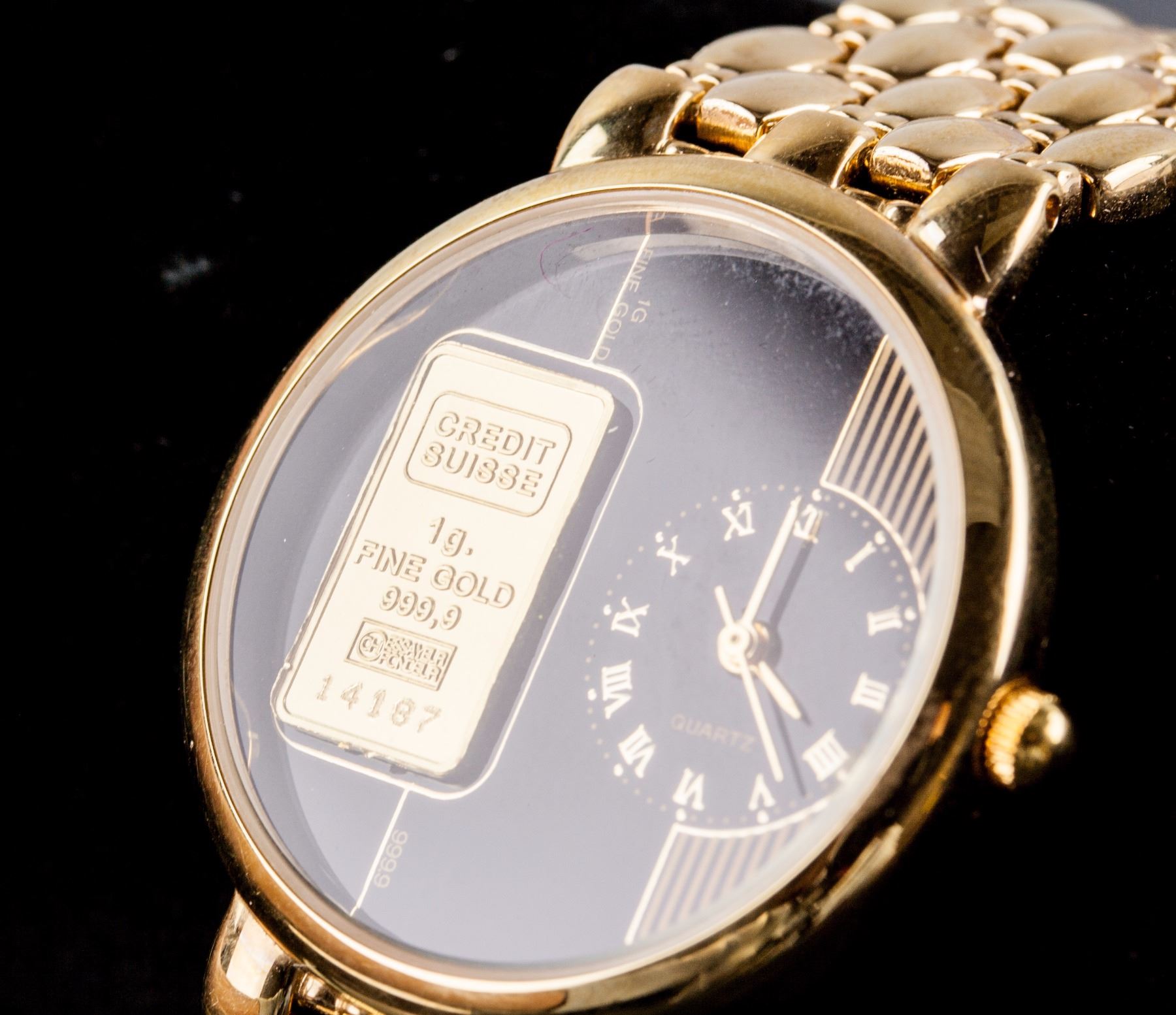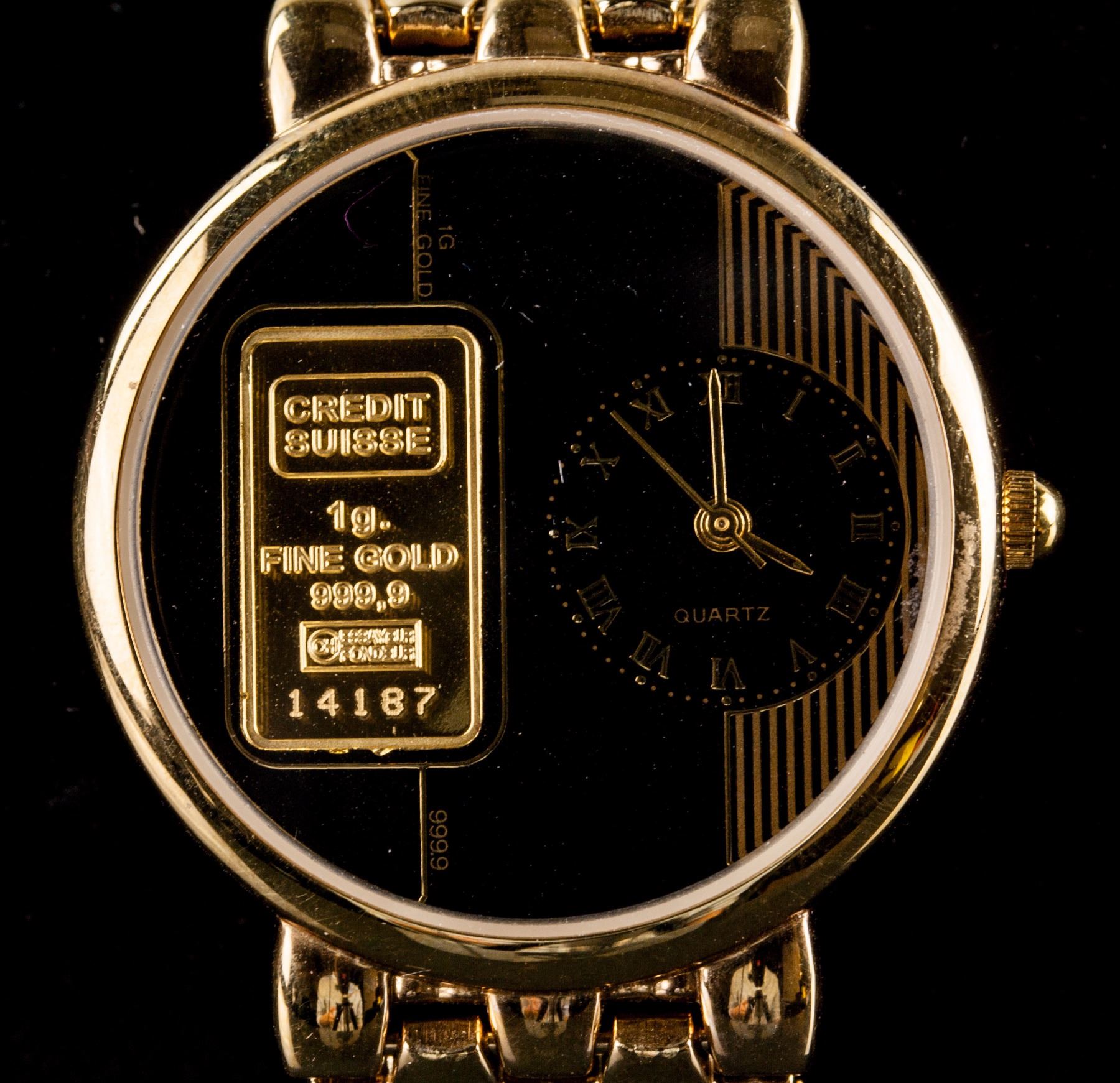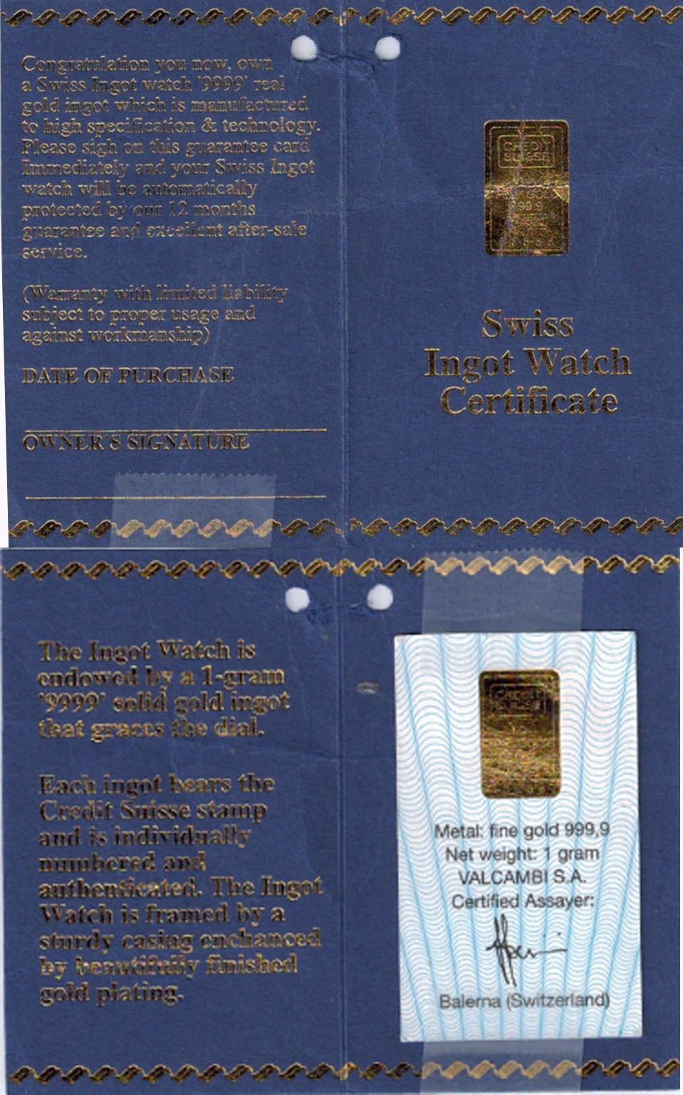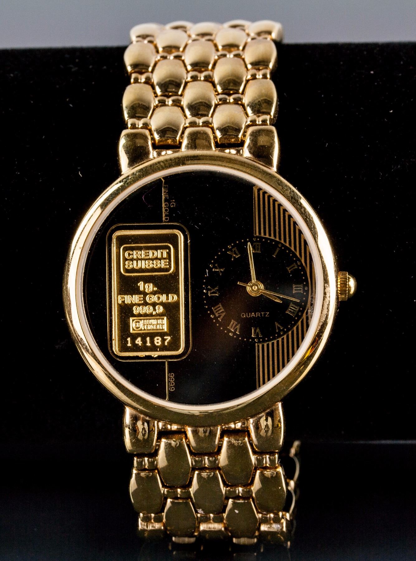 Swiss man's watch; set with a 1 gram fine gold (.9999) ingot inside of dial; serial number 14187; certified replacement value $1800; 75 grams