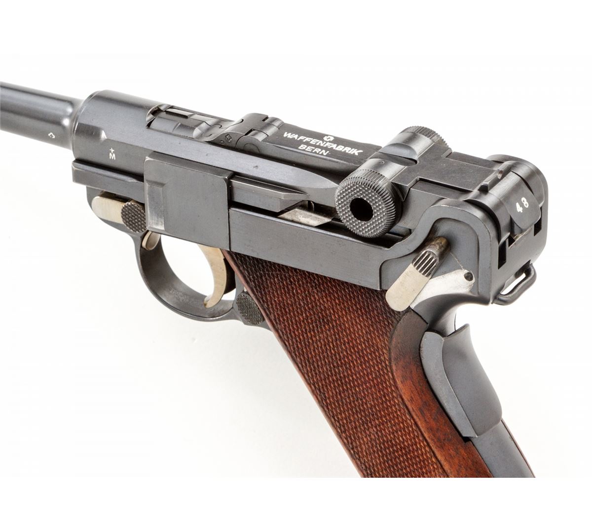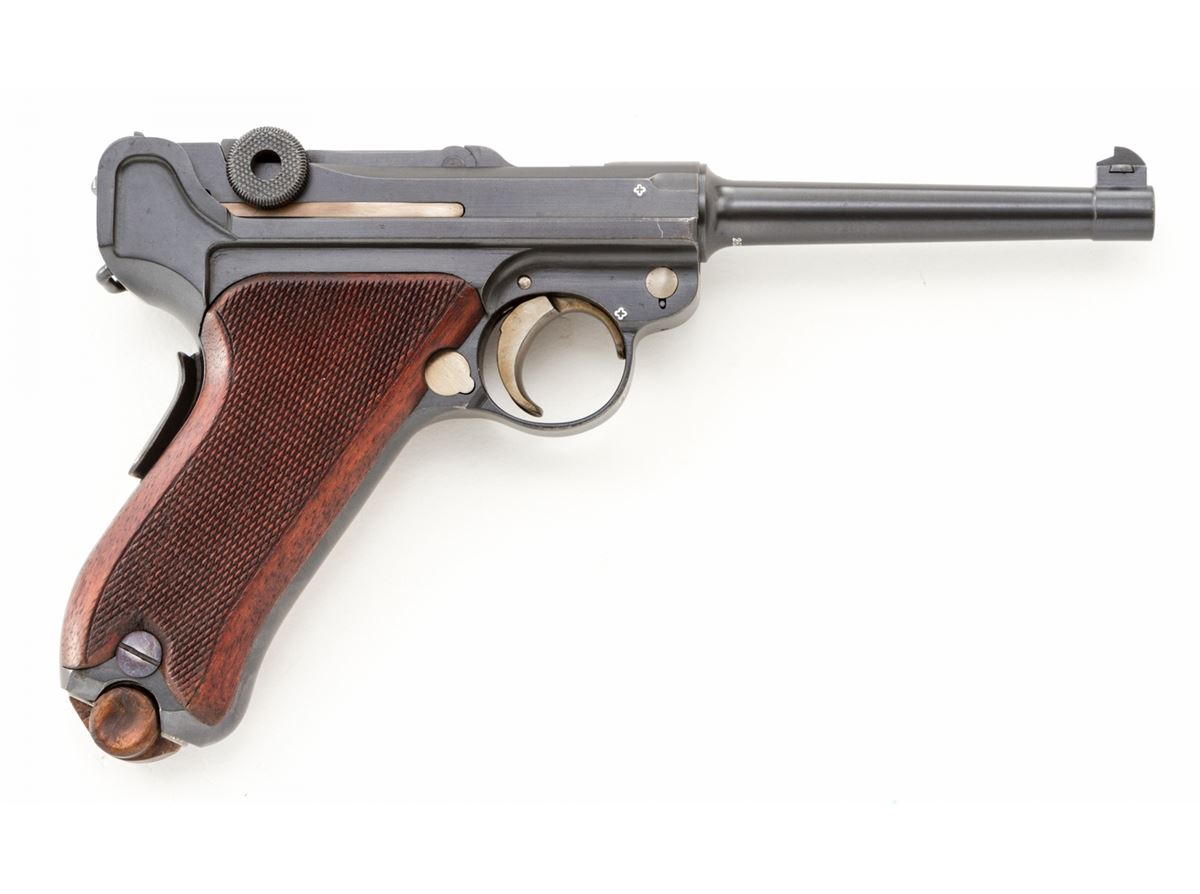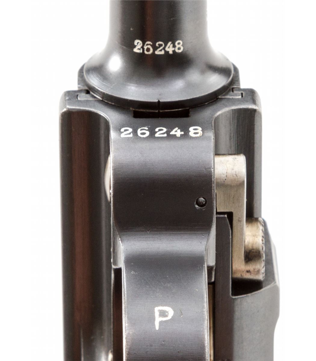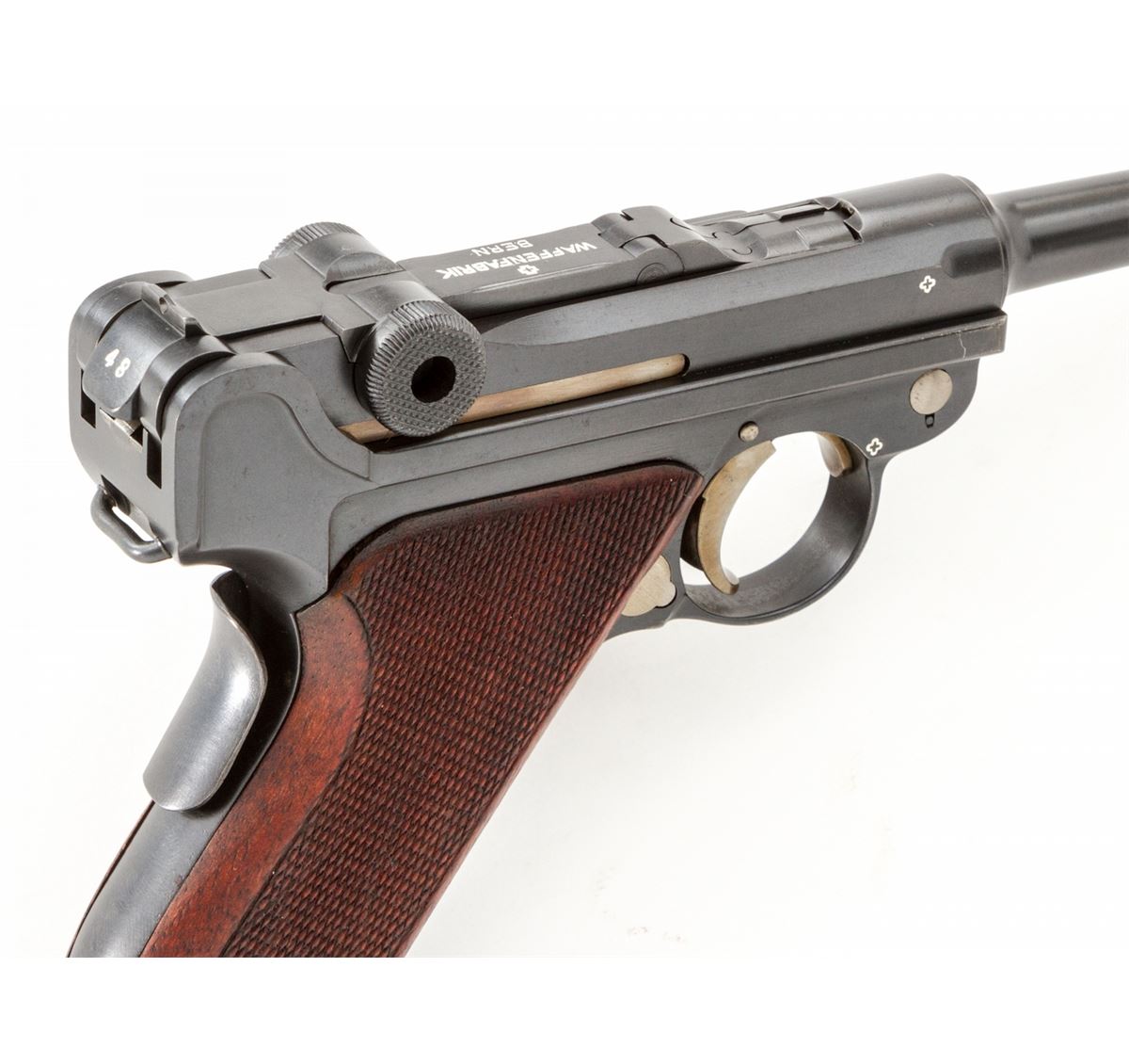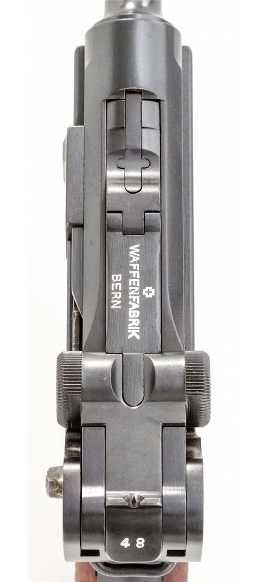 Swiss 1906/24 Luger, #26248, .30 Luger cal., 4-3/4'' barrel, blue finish with straw small parts, factory checkered walnut grips with smooth border, and one unmarked nickel-plated magazine with walnut base. Chamber area is blank, ''Waffenfabrik Bern'' to central toggle link, lower portion of safety area polished bright, with ''Geladen'' marked extractor. In 1940 dated brown leather holster. Condition is excellent retaining approx. 98% original lightly thinning blue with some wear to high edges of sideplate. Grips are crisp with some darkening near uppermost points. Action is crisp, bore is bright. All visible matching numbers with no importation markings. Holster with light oil staining and traces of previous owner's inventory markings to upper flap. Est.: $2,500-$3,500. (C&R/PPT) (John Siroonian estate)