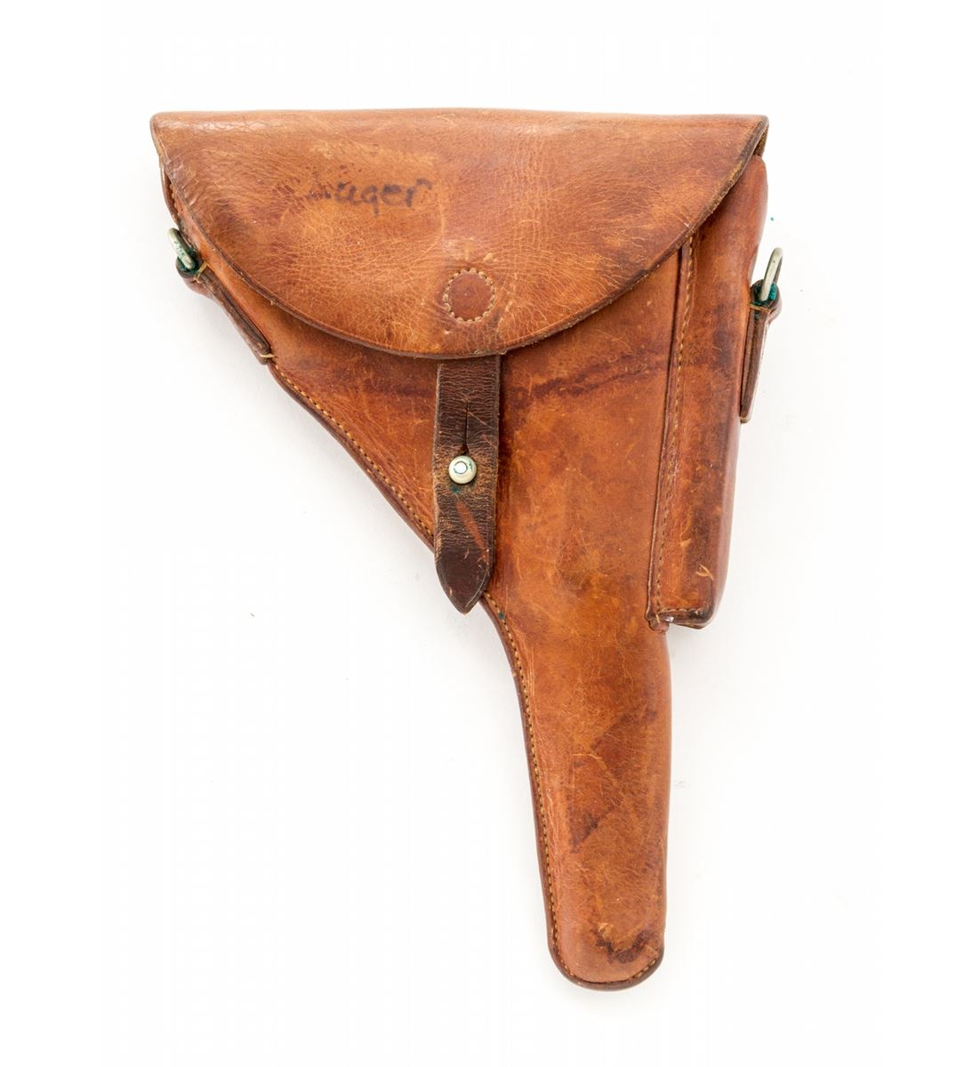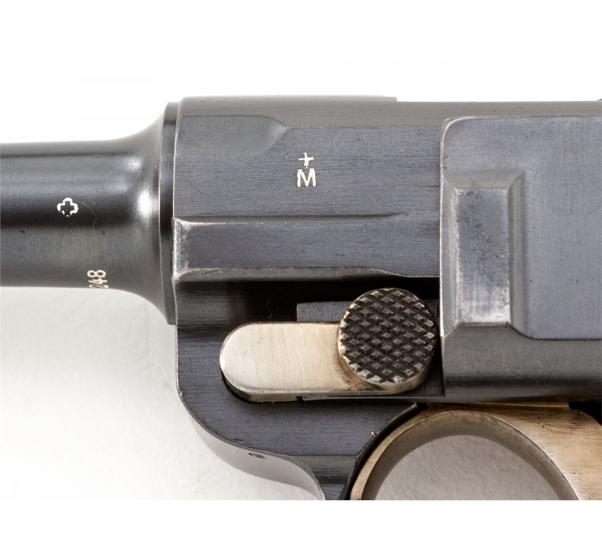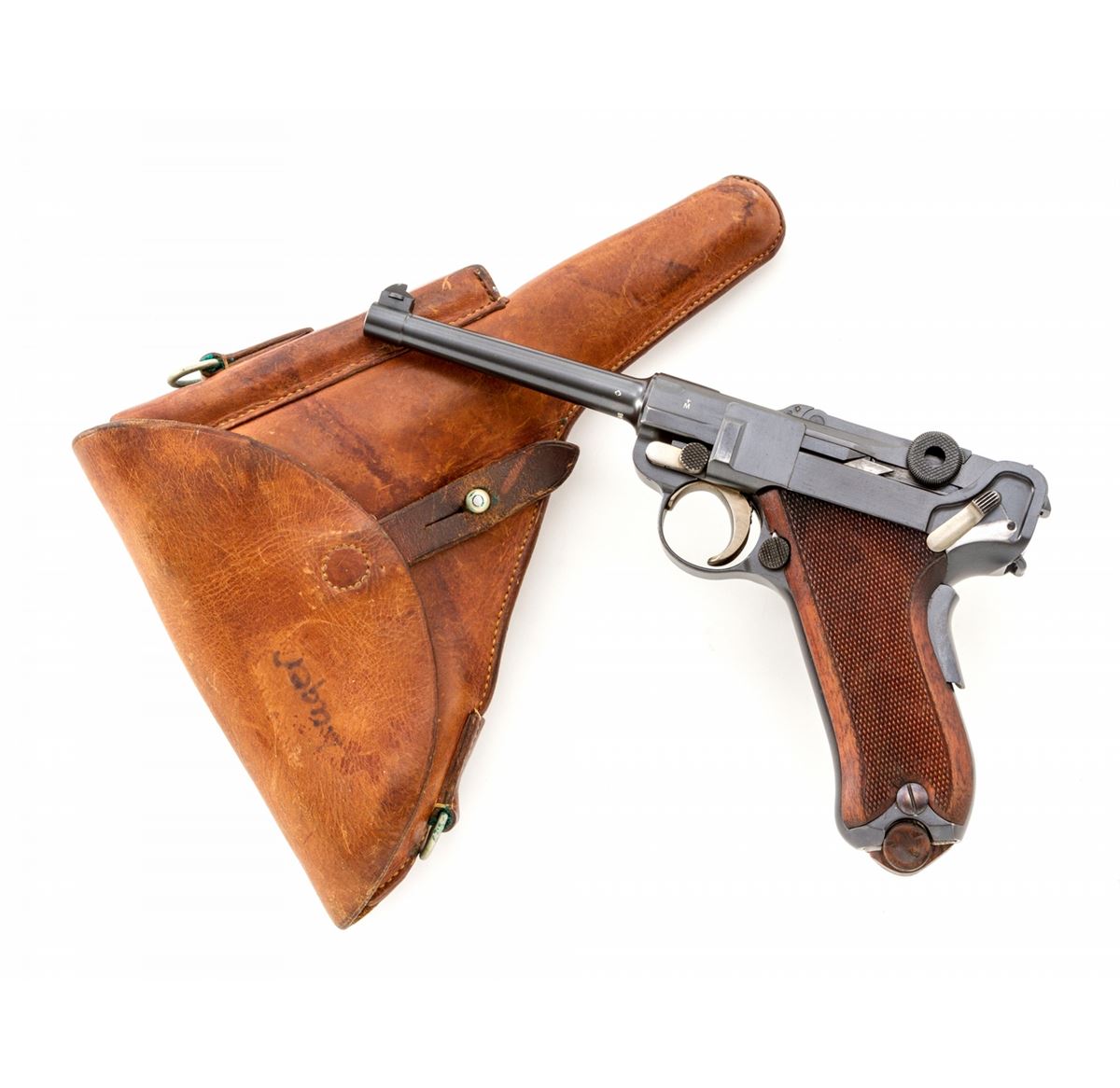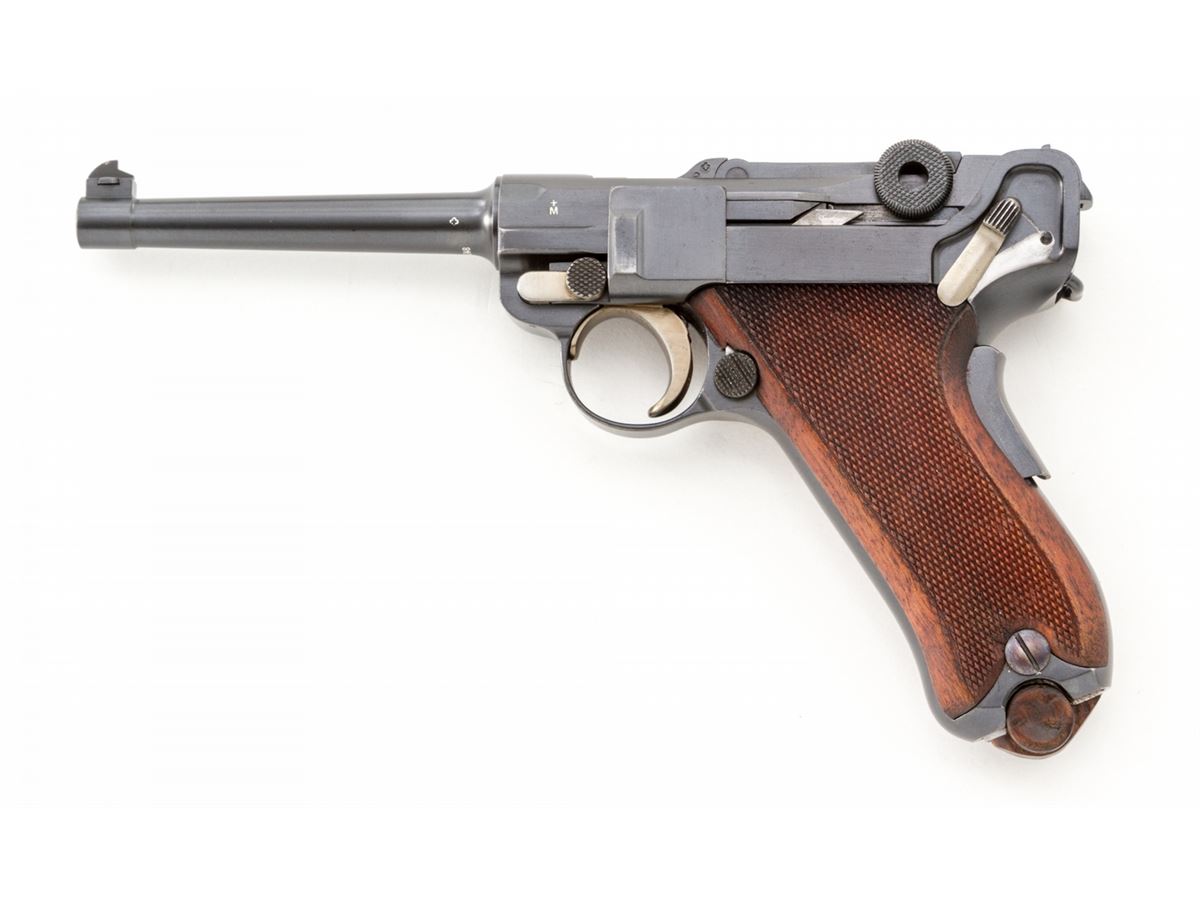 Swiss 1906/24 Luger, #26248, .30 Luger cal., 4-3/4'' barrel, blue finish with straw small parts, factory checkered walnut grips with smooth border, and one unmarked nickel-plated magazine with walnut base. Chamber area is blank, ''Waffenfabrik Bern'' to central toggle link, lower portion of safety area polished bright, with ''Geladen'' marked extractor. In 1940 dated brown leather holster. Condition is excellent retaining approx. 98% original lightly thinning blue with some wear to high edges of sideplate. Grips are crisp with some darkening near uppermost points. Action is crisp, bore is bright. All visible matching numbers with no importation markings. Holster with light oil staining and traces of previous owner's inventory markings to upper flap. Est.: $2,500-$3,500. (C&R/PPT) (John Siroonian estate)
