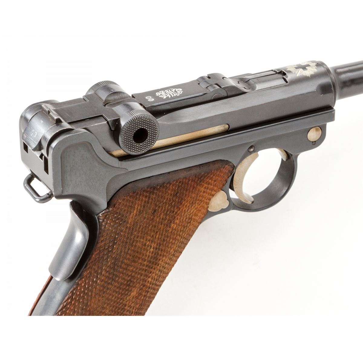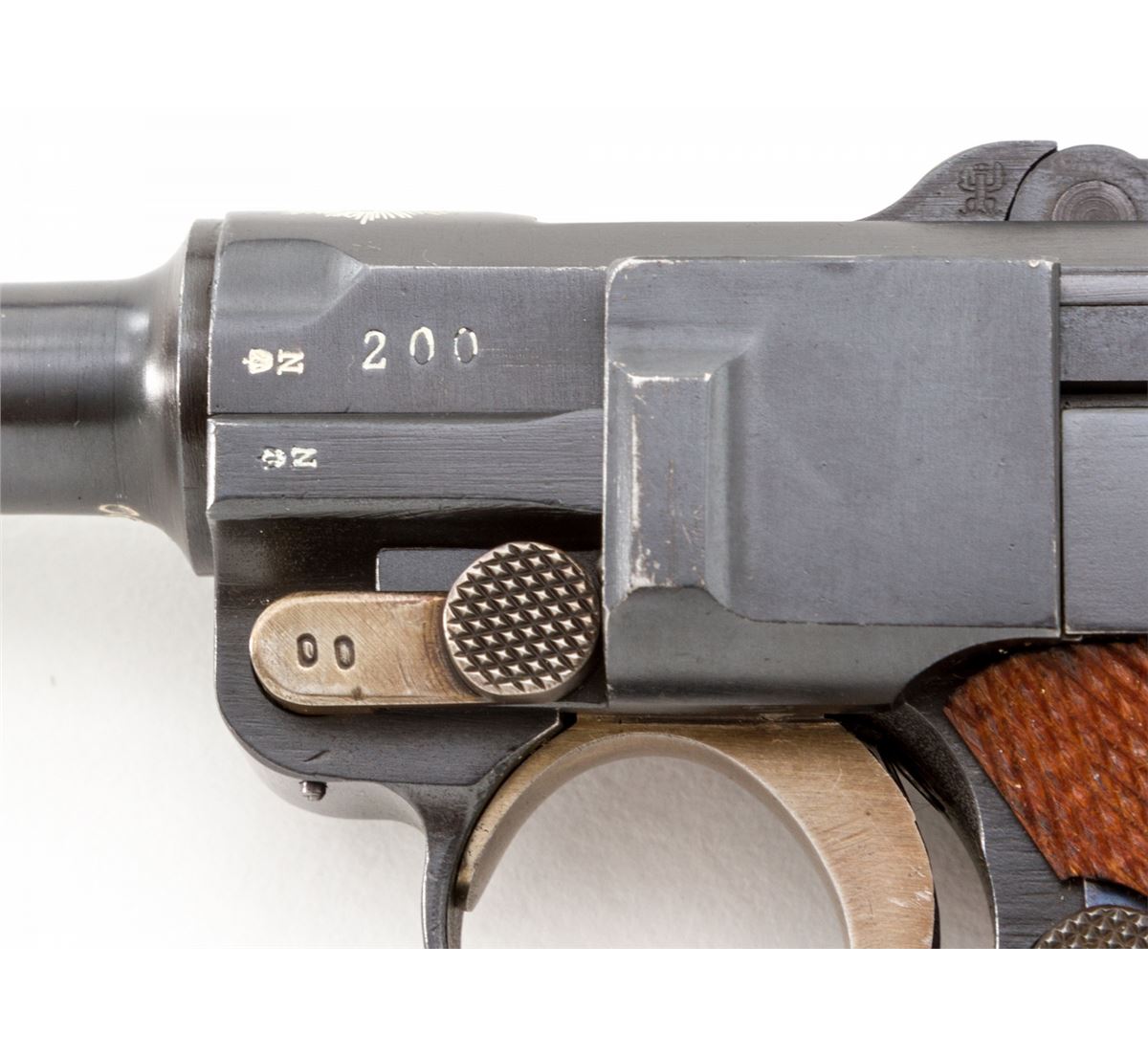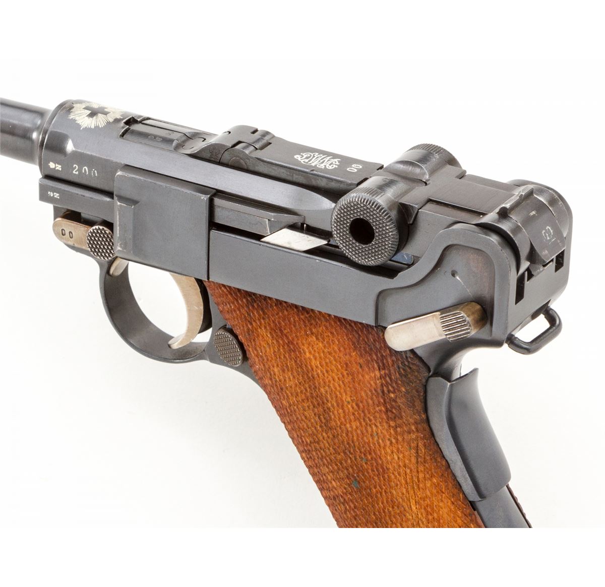 Swiss 1906 Luger, #200, .30 Luger cal., 4-3/4'' barrel, blue finish with straw small parts, factory checkered walnut grips, and one unmarked nickel-plated magazine with wood base and metal inserts. Top of chamber with cross in sunburst, DWM marked toggle link, serrated thumb safety with both upper and lower portions blued, ''Geladen'' marked extractor, ''(crown)/N'' proofmarks to frame and upper receiver. In 1908 dated Swiss brown leather holster. This particular pistol was probably a parts clean-up gun that was sold later on the commercial market. Condition is excellent as possibly arsenal refinished, retaining approx. 98% blue. All visible matching numbers. Crisp small parts, grips and action; bore is bright. Holster with light verdigris at metal attachments and very minor scuffing. This particular type holster is seldom seen having no provision for an extra magazine. This pistol lacks importation or overhaul markings. Est.: $3,000-$4,000. (C&R/PPT) (John Siroonian estate)