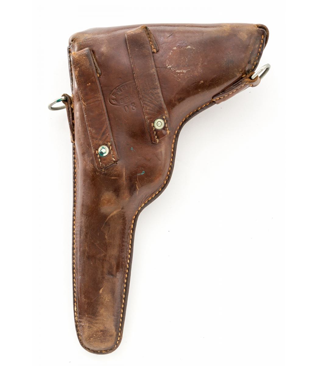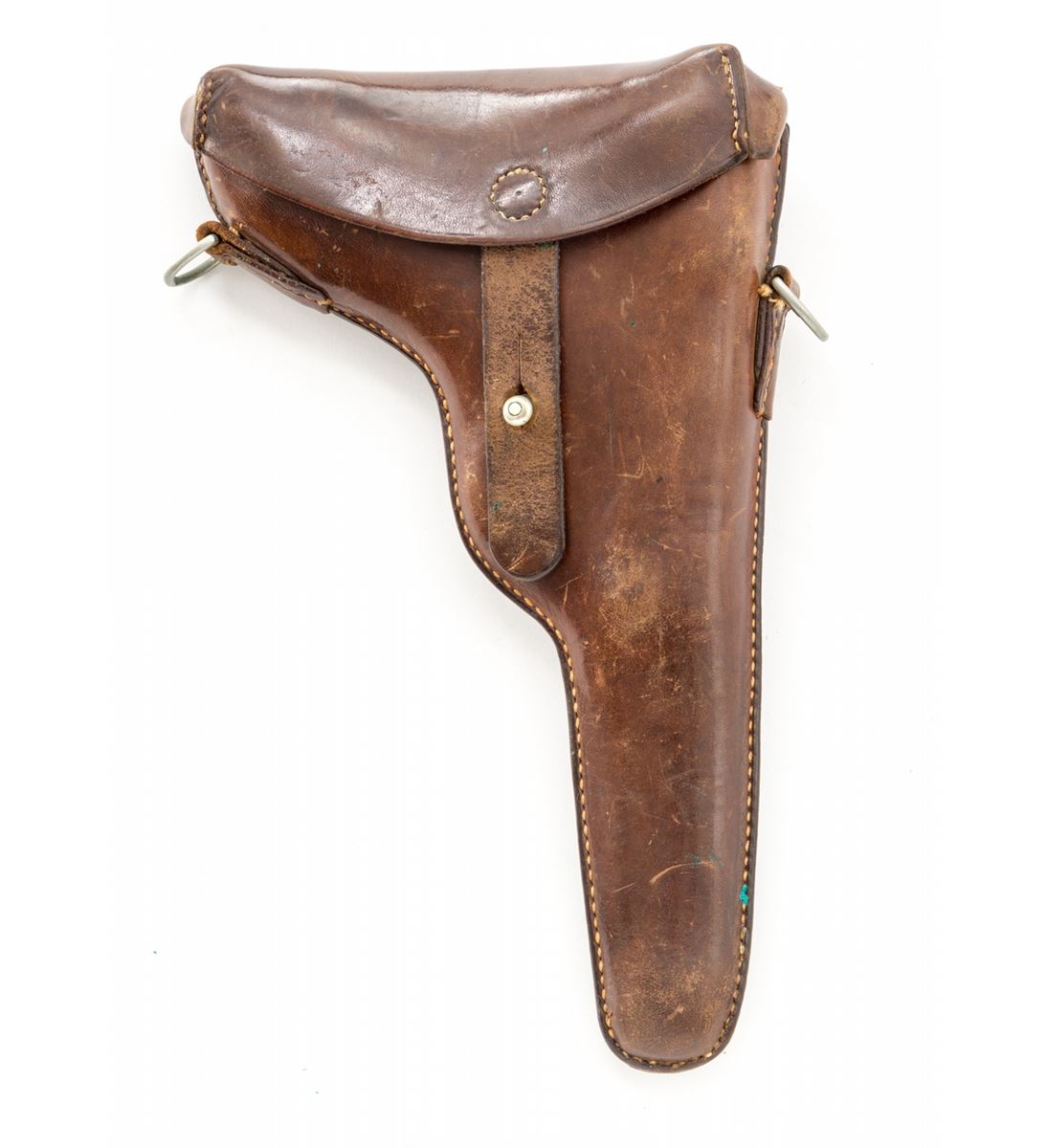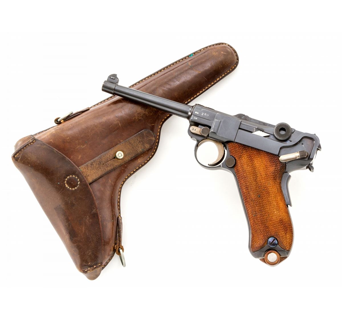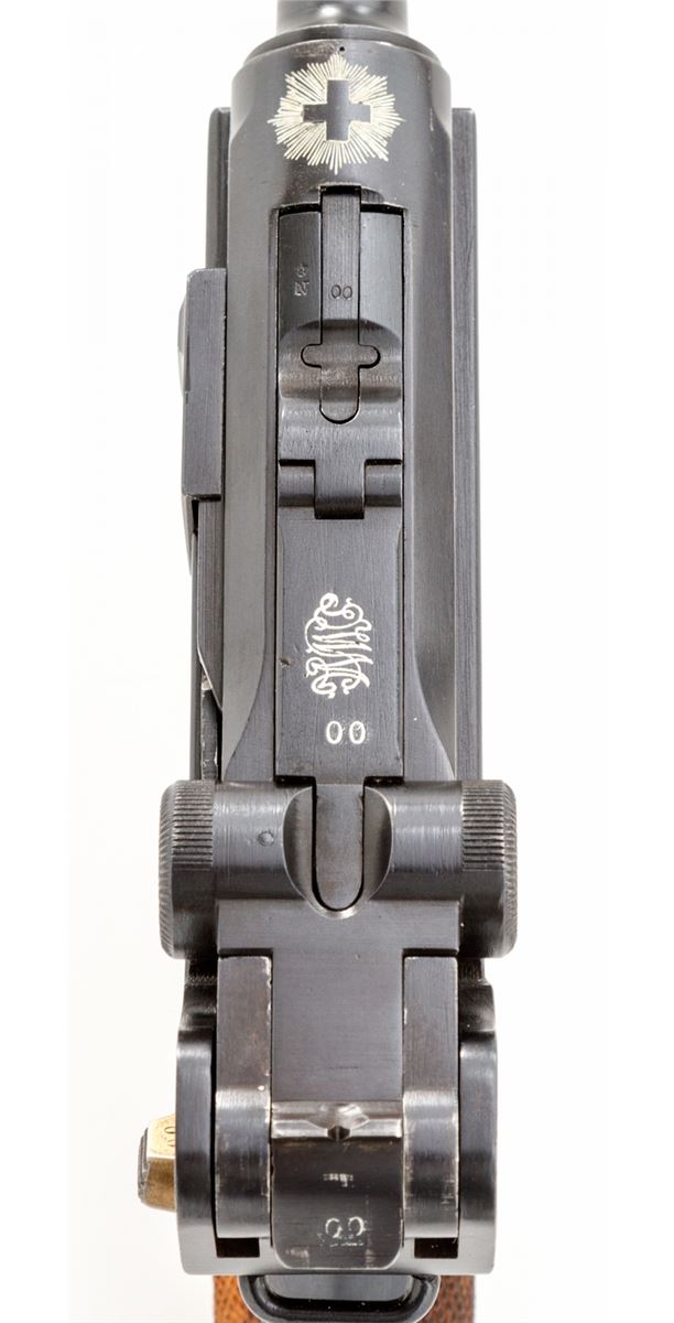 Swiss 1906 Luger, #200, .30 Luger cal., 4-3/4'' barrel, blue finish with straw small parts, factory checkered walnut grips, and one unmarked nickel-plated magazine with wood base and metal inserts. Top of chamber with cross in sunburst, DWM marked toggle link, serrated thumb safety with both upper and lower portions blued, ''Geladen'' marked extractor, ''(crown)/N'' proofmarks to frame and upper receiver. In 1908 dated Swiss brown leather holster. This particular pistol was probably a parts clean-up gun that was sold later on the commercial market. Condition is excellent as possibly arsenal refinished, retaining approx. 98% blue. All visible matching numbers. Crisp small parts, grips and action; bore is bright. Holster with light verdigris at metal attachments and very minor scuffing. This particular type holster is seldom seen having no provision for an extra magazine. This pistol lacks importation or overhaul markings. Est.: $3,000-$4,000. (C&R/PPT) (John Siroonian estate)