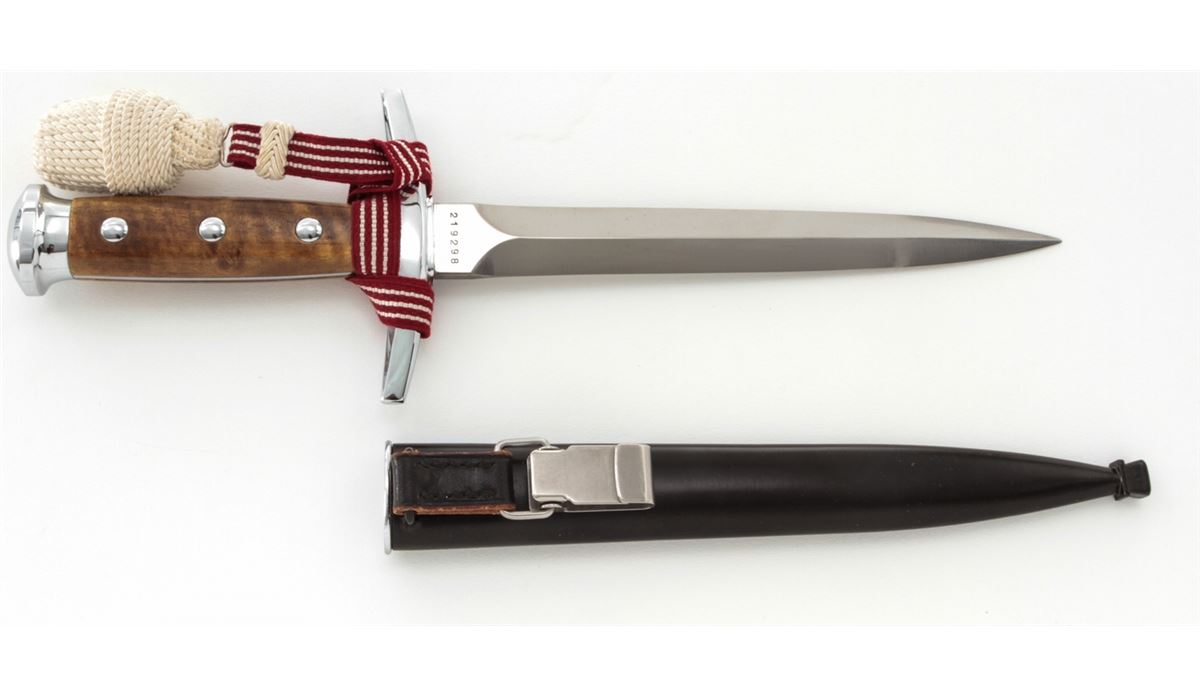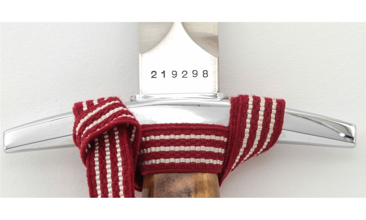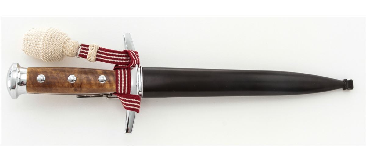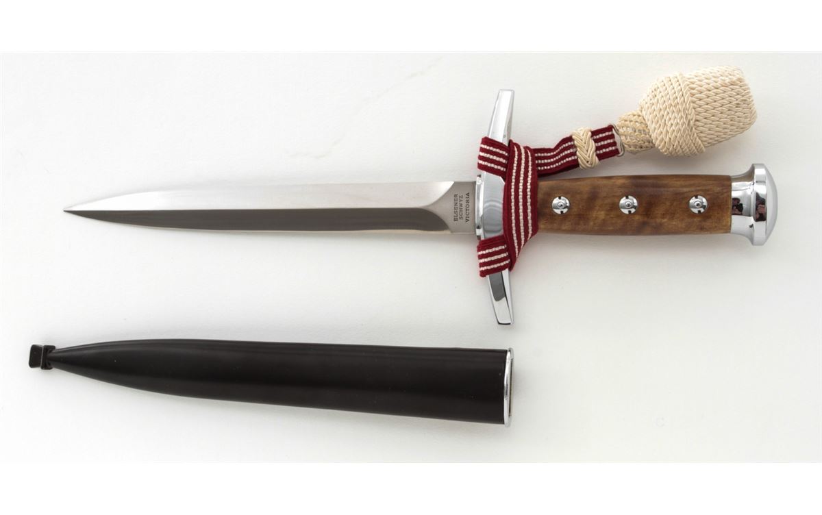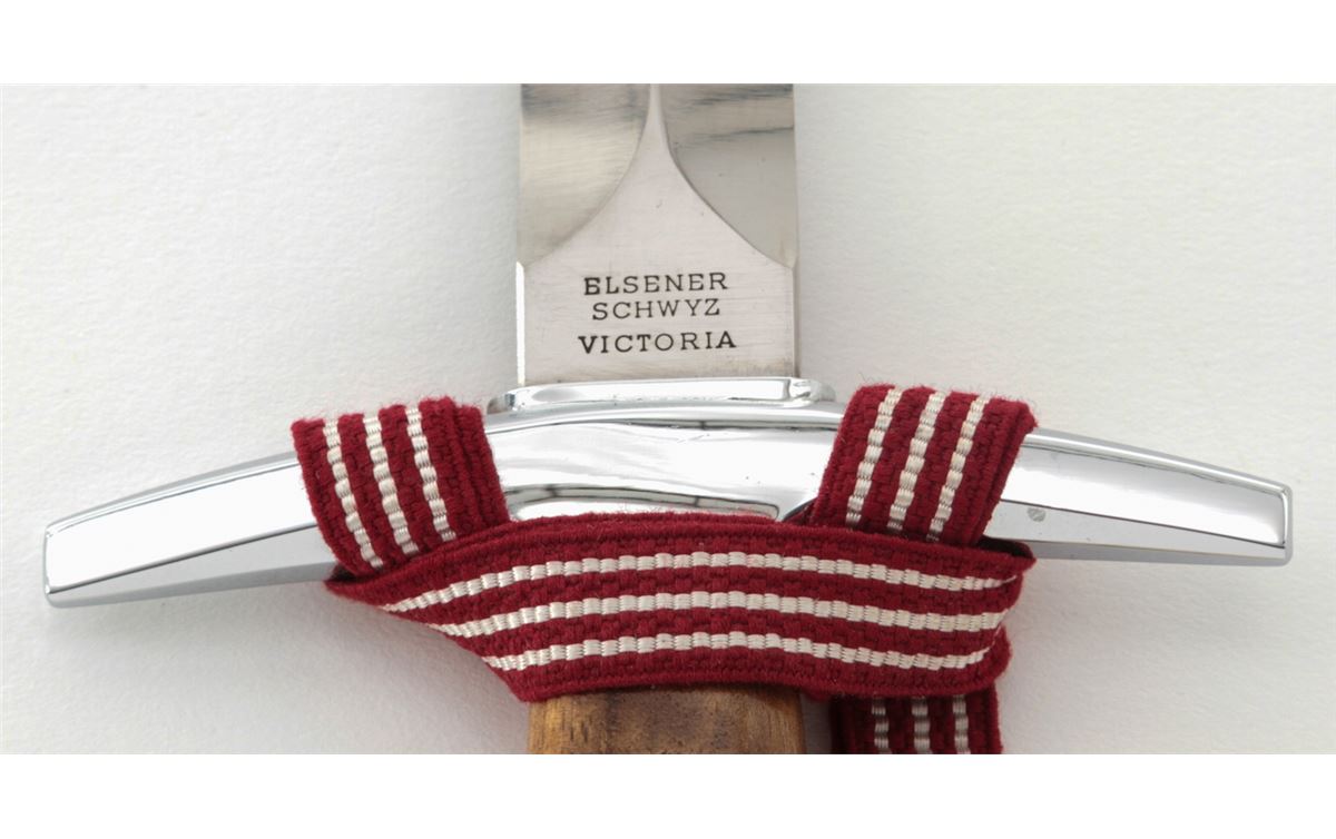 Swiss Army Officer's Dagger, by Elsener Schwyz, Victoria, #219298, 8-1/4'' blade, 13-1/4'' overall, nickel-plated guard and pommel, hardwood handle, red & white ribbon, white portapie, and black metal scabbard with belt hanger. Condition is fine overall with moderate scratches and scabbard wear to blade. Wood grip with light marks from handling; portapie and ribbon remain tight and are free of any soiling or fraying. Est.: $350-$450.