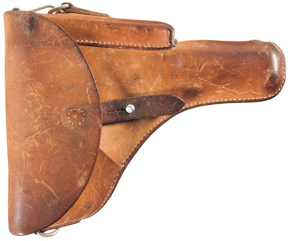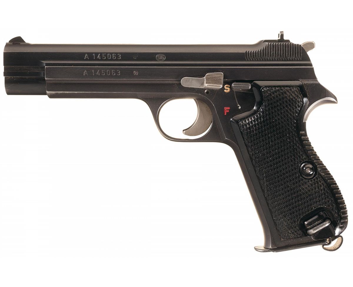 Introduced in 1949, the P210 remains in service with the Swiss and Danish militaries. Fixed sights with the Swiss "cross in shield" stamp on the rear sight base. Matching serial numbers on the slide, frame and barrel, "SIG" maker's mark on the slide and "P" on the front of the trigger guard. Fitted with a manual safety, magazine well safety, serrated slide catch, heel-mounted magazine catch and checkered grips. With a brown leather flap holster, marked "K.FISCHER/195/SEFTIGEN" on the rear, with a shoulder strap.
