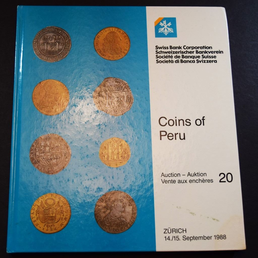 Swiss Bank Corporation. COINS OF PERU. September 14-15, 1988. 1-1356 lots. 4to. This auction sale catalog includes numismatic material from Peru from the collection of Dr. Ernesto Sellschopp. Included in the sale are gold and silver coins from the reign of Phillip II (1556-1598) through the Republic Period. Cataloged by Freeman Craig, Jr. Zürich. Sale No. 20. original pictorial boards. Fine. 220 pages, 3 color plates. b&w plated throughout. Bibliography. Lot weight: 1 lbs 13oz. Subject(s): Latin American Coinage.