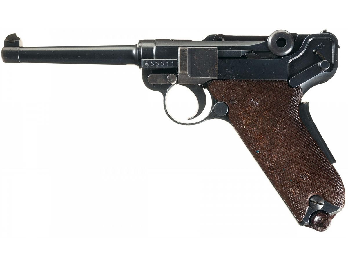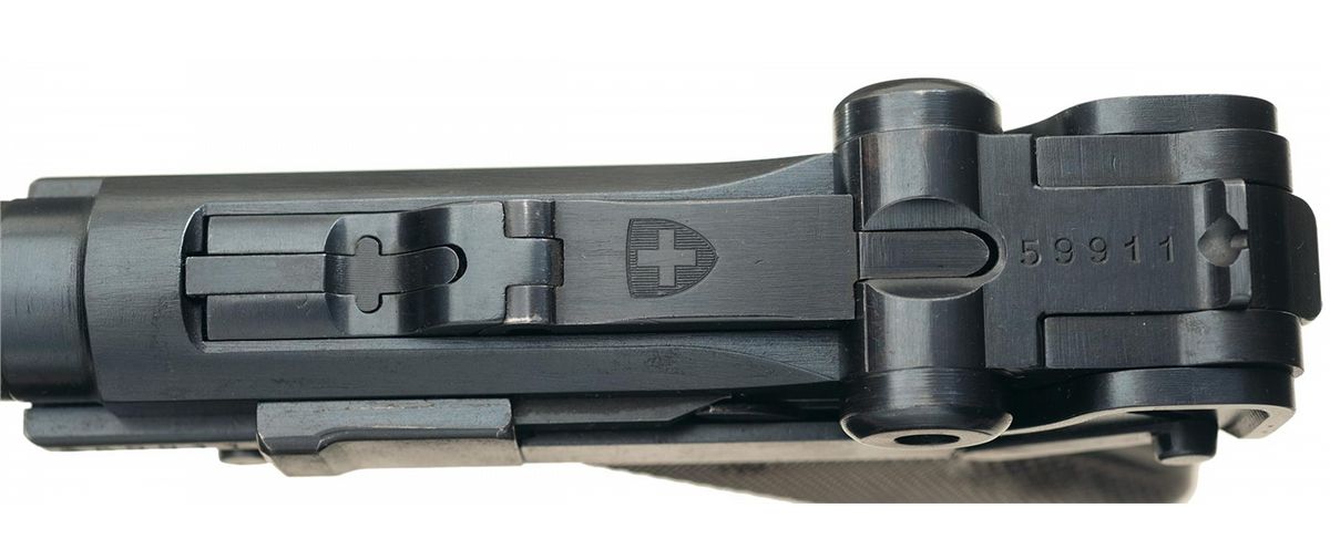 This is a nice example of an early 1929 Swiss commercial contract Luger as manufactured by the Bern factory Switzerland. These 1929 pistols were the last configuration as used by the Swiss. The top of the chamber is unmarked and the front toggle has the "Swiss Cross in a Shield" markings. The 7.65mm barrel is correctly numbered on the side of the shoulder and has a small "Swiss Geneva Cross", acceptance proof on the underside with the full serial numbered on the left side frame rail (and not on the front end) and again on top of the rear toggle. There is a small Crown over "M" on the right side rail and a small "Swiss Geneva Cross" acceptance proof on the major components indicating acceptance at the Bern factory. It is fitted with a standard Swiss, nickel plated magazine with the unnumbered brown plastic base. The serial number has the single "P" proof indicating release by the Swiss Government. This excellent Luger is complete with an original late pattern Swiss Luger leather holster and shoulder strap. The back of the holster is stamped: "W.GEERING/BERN/32" and is complete with one spare Swiss Luger magazine.