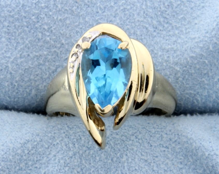 The pear shape swiss blue topaz measures 10mmx7mm and weighs approx. 2 carats. There are 3 diamonds total weight 0.03cts. Size 6.5 5.4g